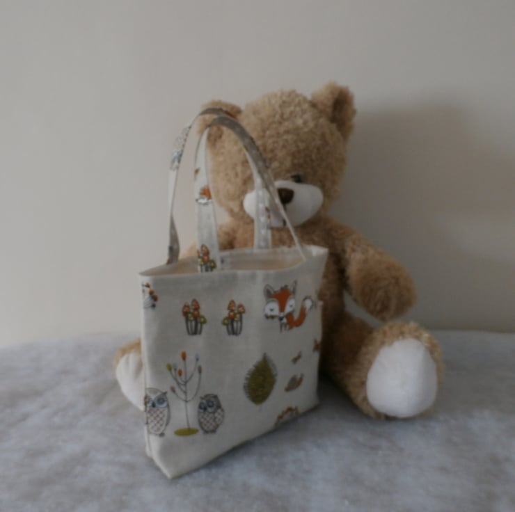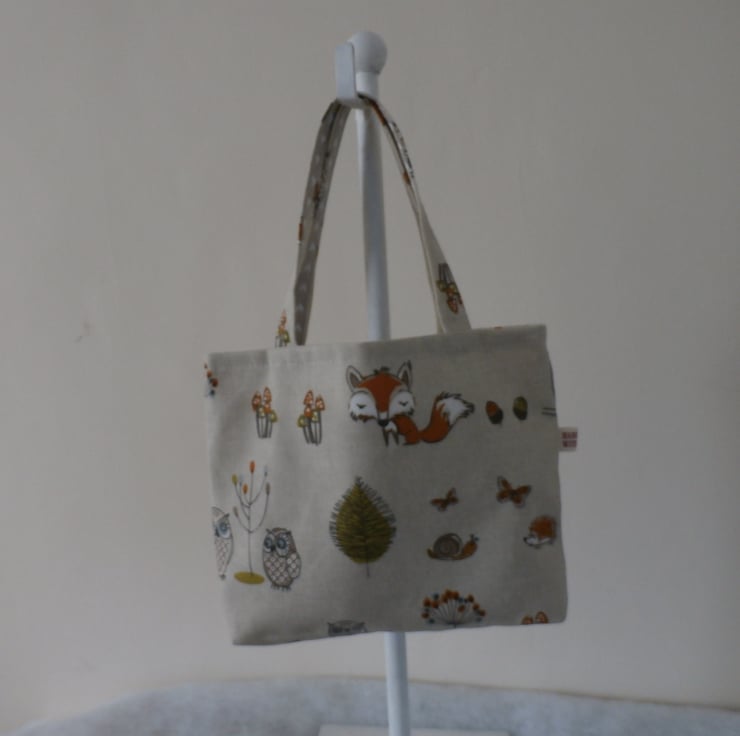 This little girls tote bag is made from a fawn 100% cotton fabric with Mr fox and his friends from the woods. Owls, butterfies, hedgehogs, snails, mushrooms and tress.