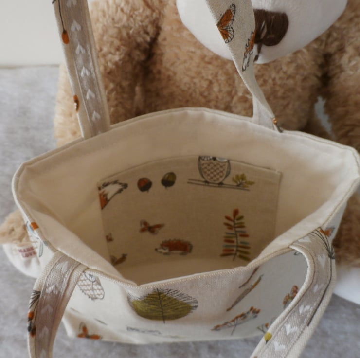 The inside of the bag is lined in a cream cotton fabric with a patched pocket made from the same woodland friends fabric.
