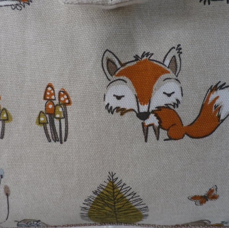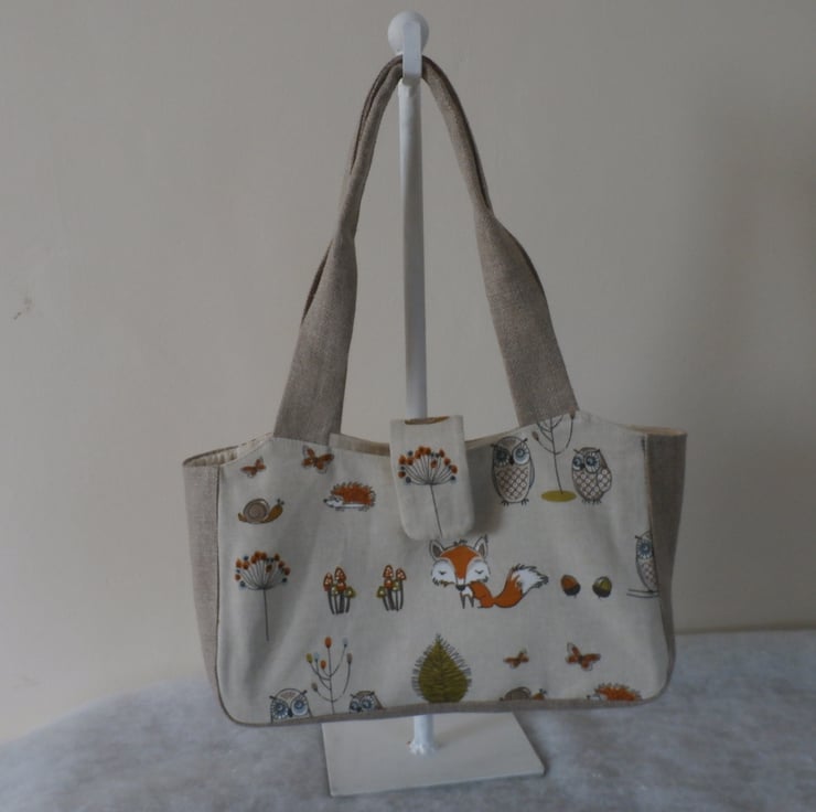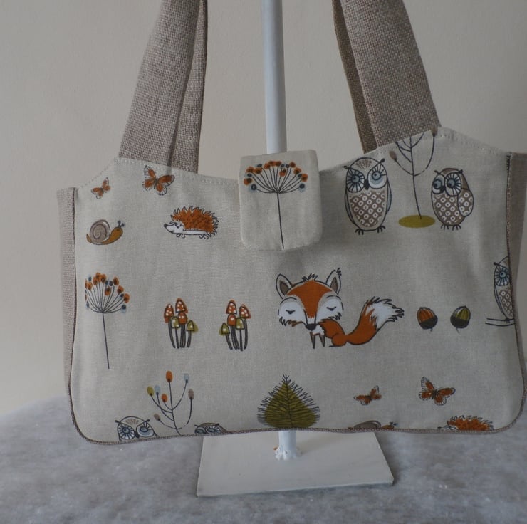 This hand bag is made from 100% cotton fabric Mr fox and his woodland friends, owls, hedgehogs, snails, butterfies, tress, mushrooms and acorns. fold over flap with a magnetic clasp. all seams have been top stitched , I have interfaced the fabric making it feel a little padded and firm.