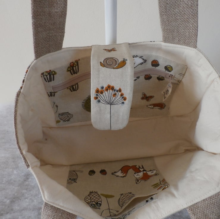 Shoulder Bag Hand Bag in woodland friends Cotton Fabric with Hessian Handles