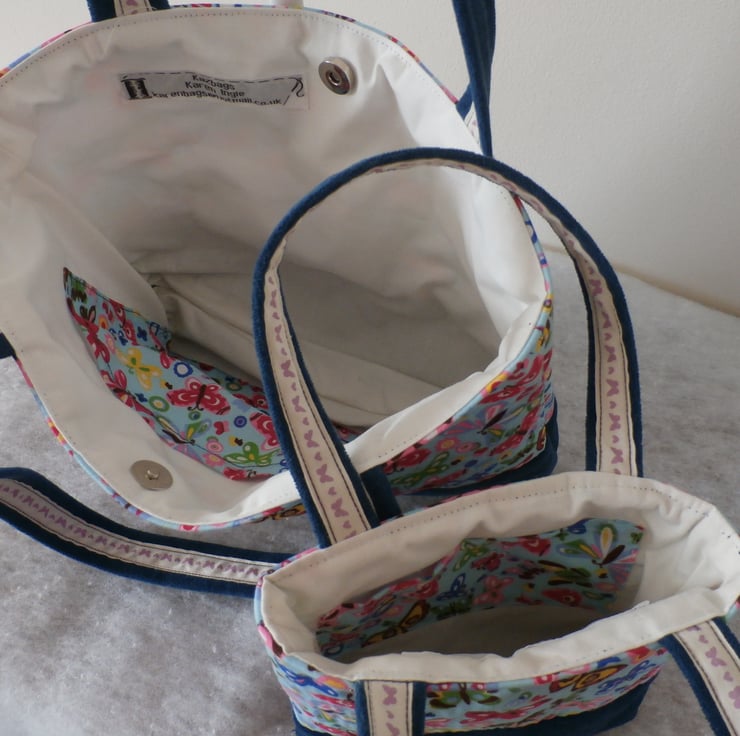 The base and handles are made from a navy blue upholstery fabric , the handles have a cream cotton tape stitched on the inside with a butterfly print in purple. All seams have been top stitched for detail and both bags have been interfaced making them firm .