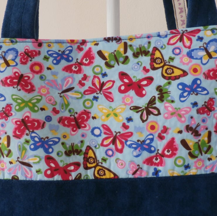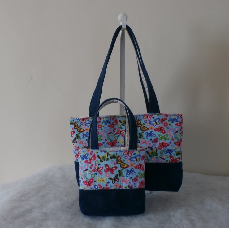 Both bags are made from a light blue cotton fabric with multi coloured butterflies.