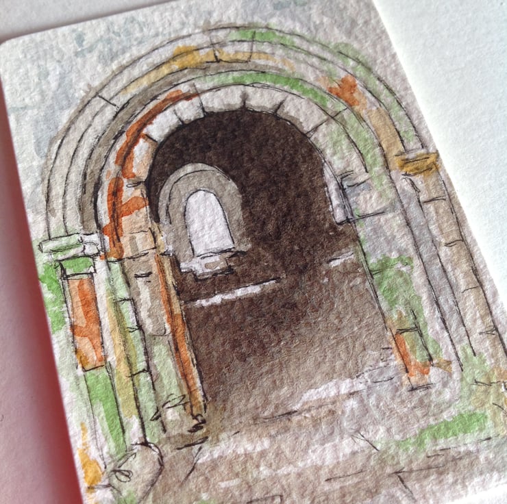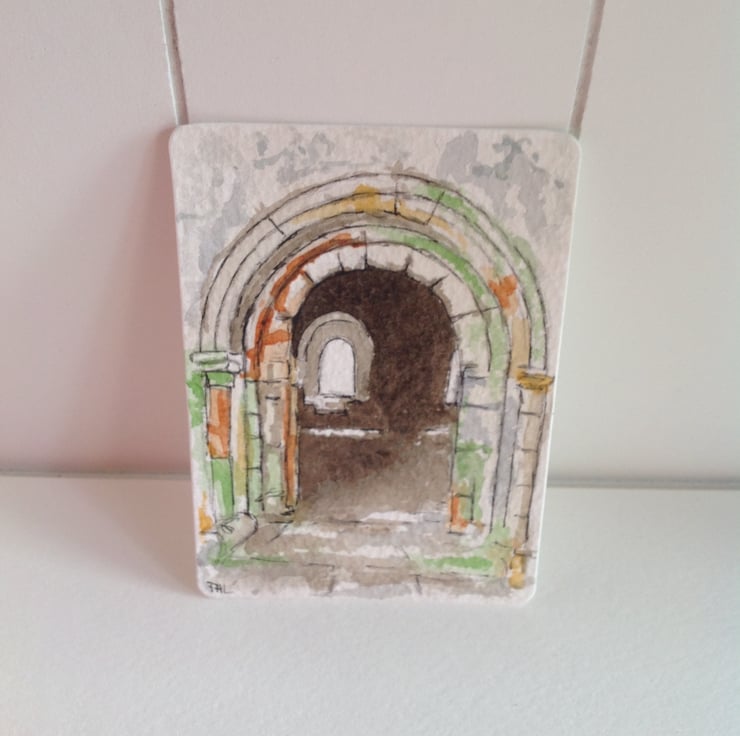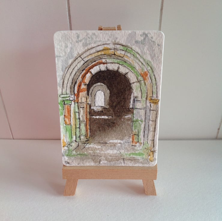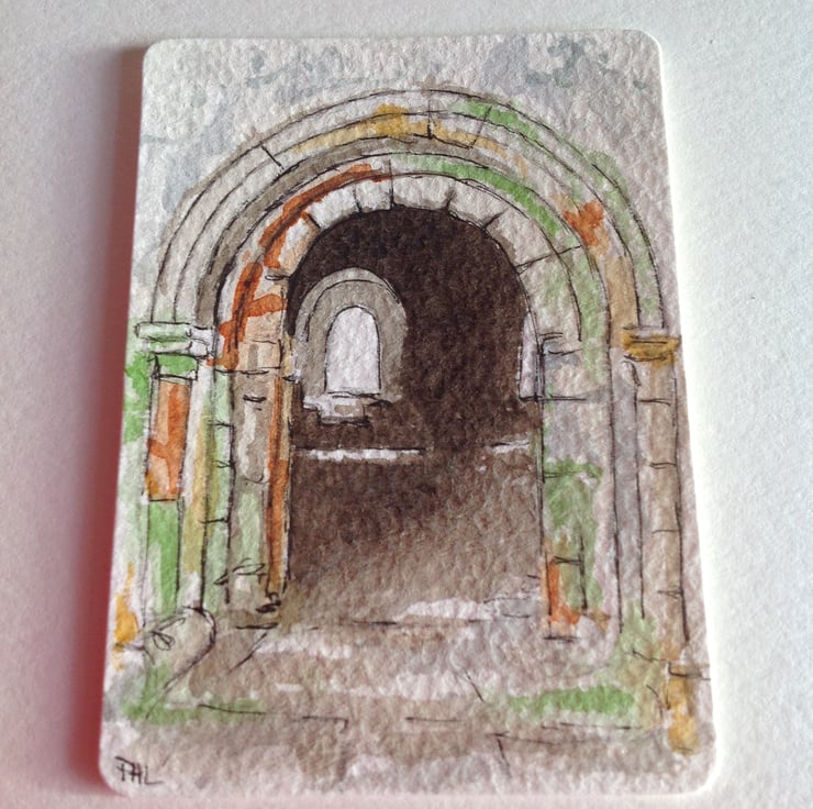 An original watercolour of a view through the archway at Inchcolm Abbey in the Firth of Forth, Scotland.
