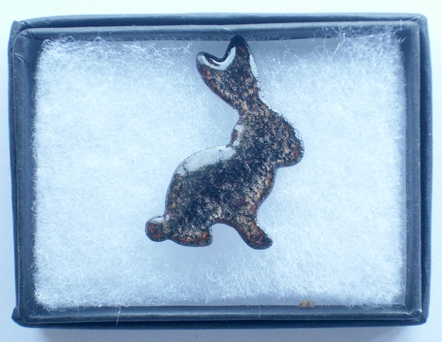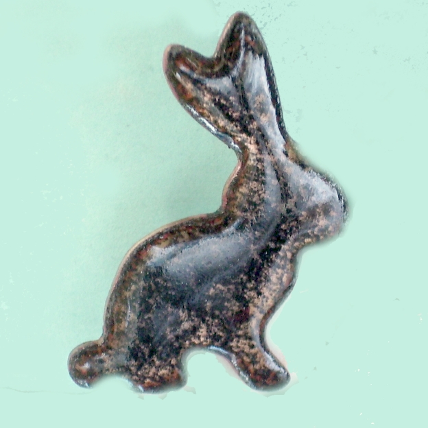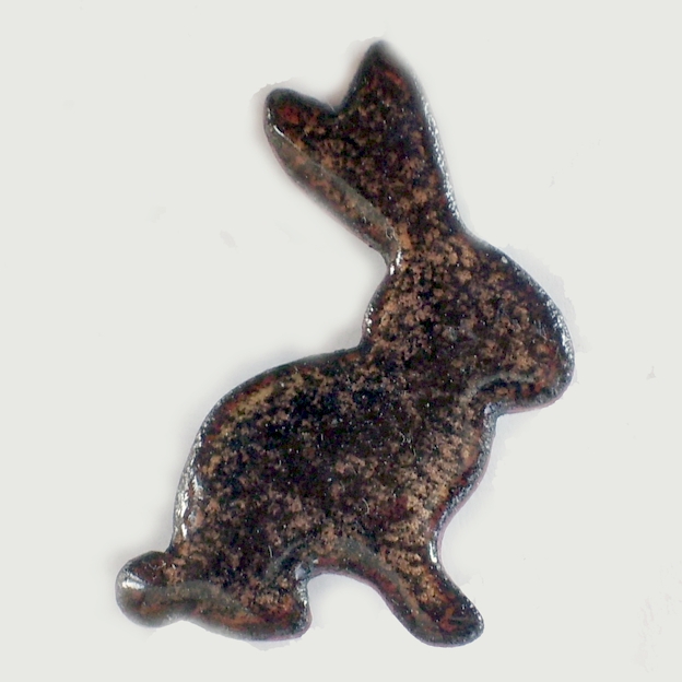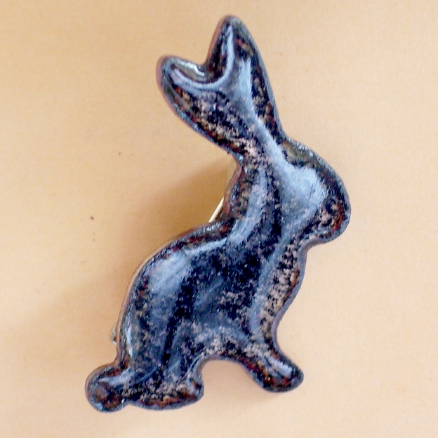 I've made this rabbot by scattering black enamel over clear. This creates an effect where the golden brown of the copper base can be seen through the black, shifting in the light, suggesting the rabbit's fur.