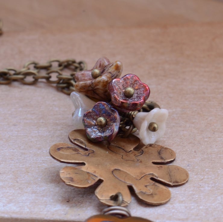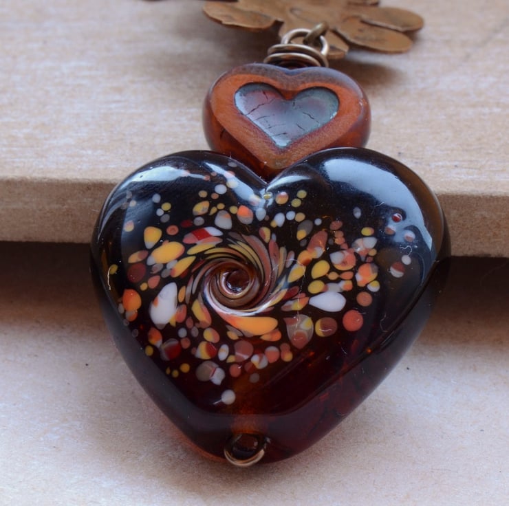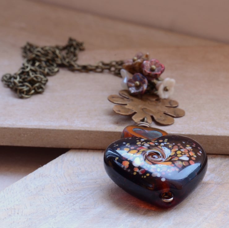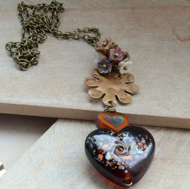 An amber lampwork glass heart bead teamed with Czech orange heart bead, etched brass flower with butterfly motif and little flower cup cluster of Czech flower beads in shades of red, cream, bronze finished with antique bronze plated chain and trigger clasp.