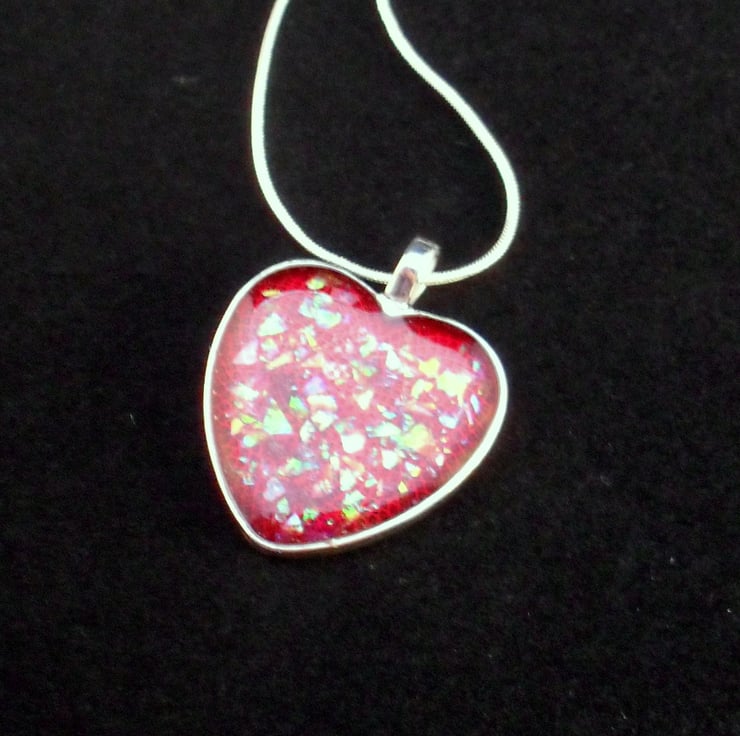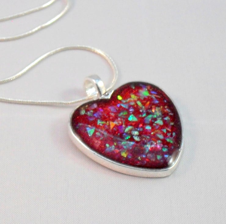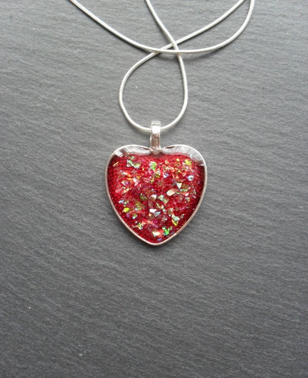 Handmade Resin heart pendant with red resin with glitter particles which makes a lovely pattern and plenty of sparkle with a shimmer of different colours in the light then having a layer of clear resin on the top and