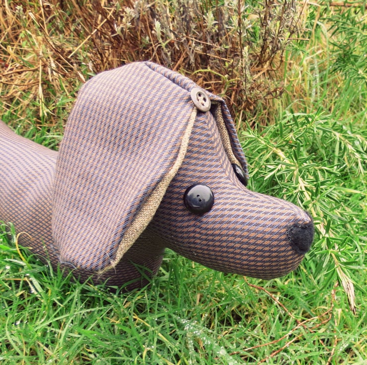 Her floppy ears are lined with a soft oatmeal wool, and her eyes are vintage buttons.