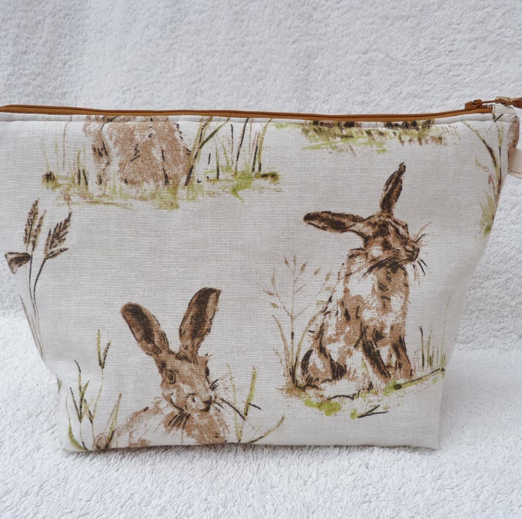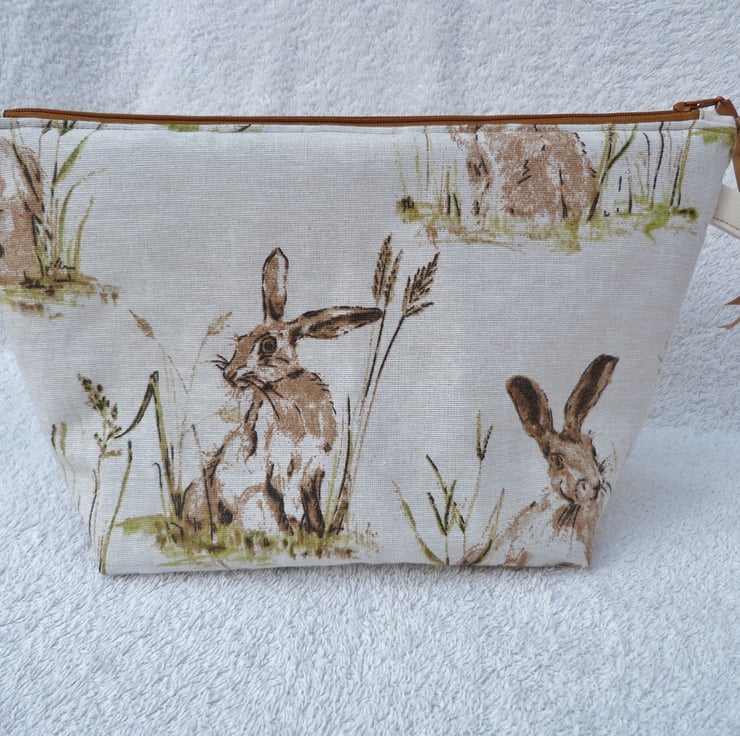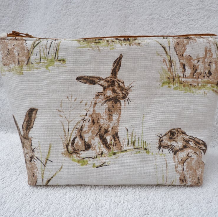This fabulous holdall has been created from a lovely hare print cotton fabric. It is fully lined, with wadding to give structure, and has an internal pocket. The pouch has a squared off base to make it really nice and roomy, and free-standing.