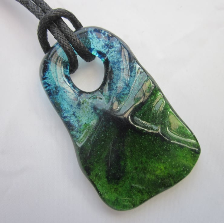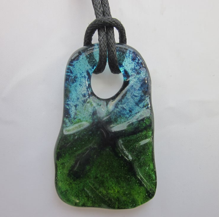 It is a stunning ornament, with multiple layers of turquoise blue and emerald green frit, including sparkling aventurine, creating a beautiful deep image. The surface is textured to provide a contour of a dragonfly making this a very tactile piece. This is a unique and eye catching piece of costume jewellery.