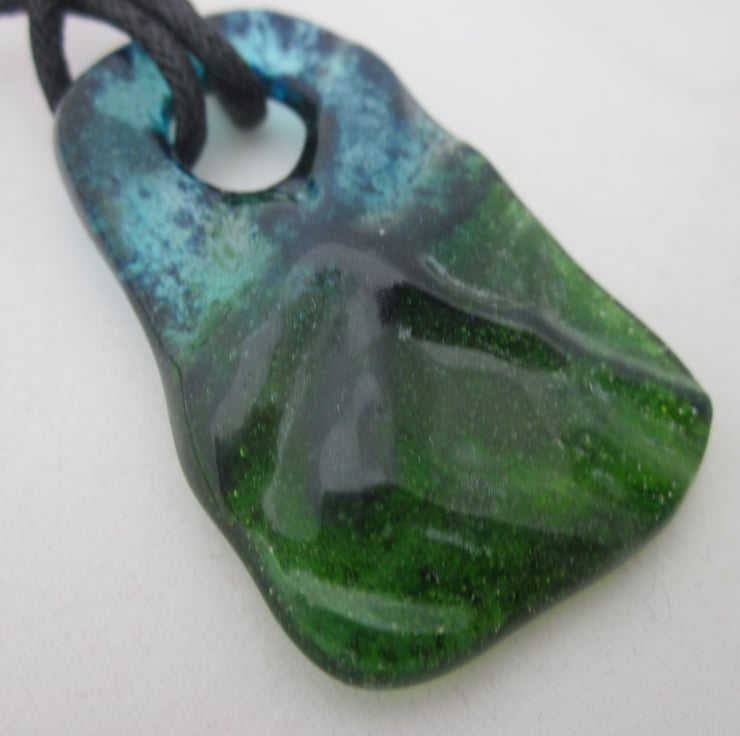This glass cabochon was fused by me. It was cast in a mould and then the glass was heated up to around 780 degrees celsius in a small glass fusing kiln and then it was then brought to annealing temperature to make it strong. It was smoothed in my grinder then fire polished in the kiln to create the smooth glossy surface. This whole process takes over 17 hours to complete.