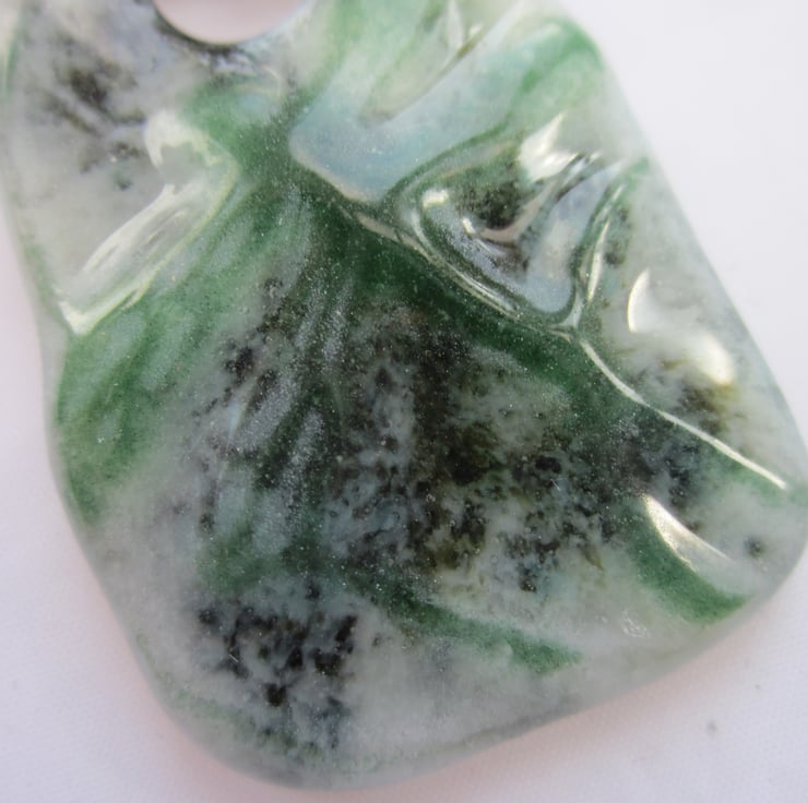 It is a stunning ornament, with multiple layers of green and ivory frit, including sparkling aventurine, creating a beautiful marbled effect. The surface is textured to provide a contour of a dragonfly making this a very tactile piece. This is a unique and eye catching piece of costume jewellery.