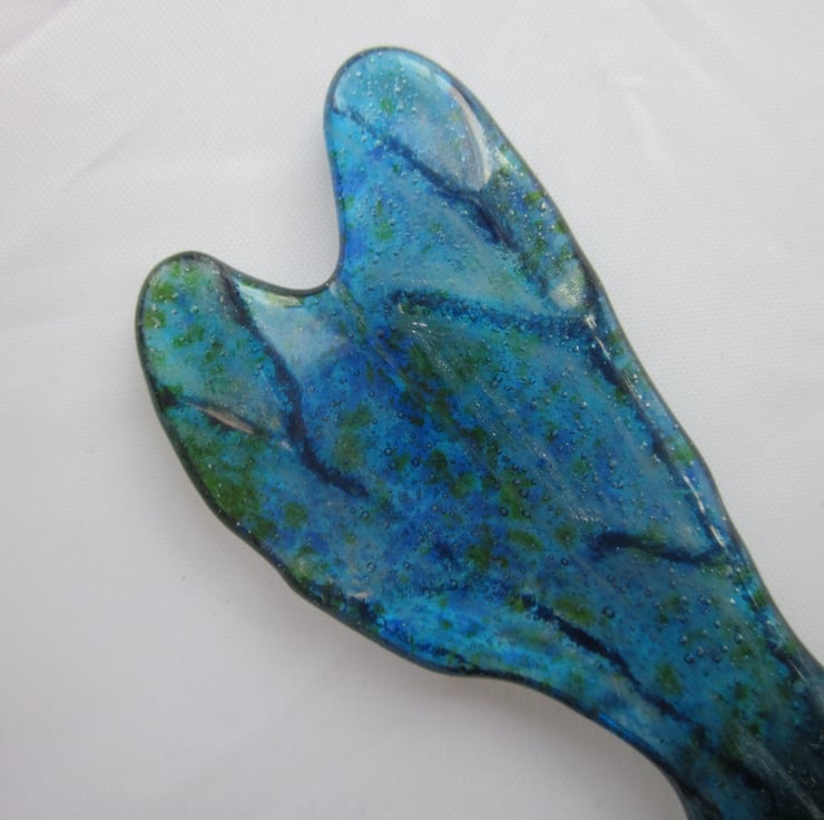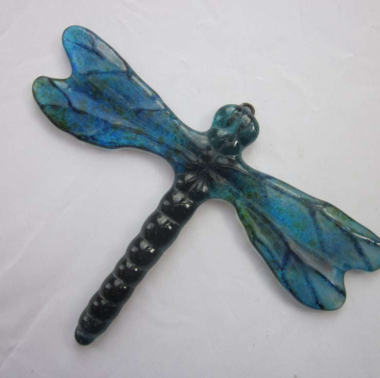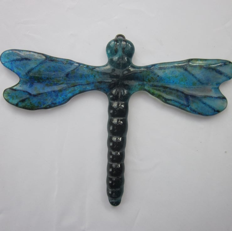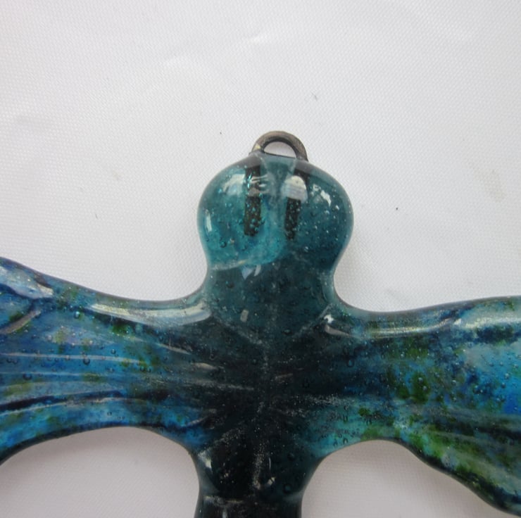 It is a stunning dragonfly, with a deep turquoise body and delicate wings in blue and green. The glass is very tactile with raised veins in the wings and three dimensional body. Beautiful! It has a copper loop as it's antennae, allowing this ornament to be hung in a window to catch the light or to sit on a dresser or shelf.