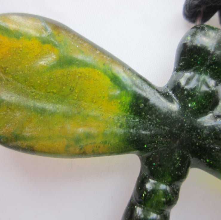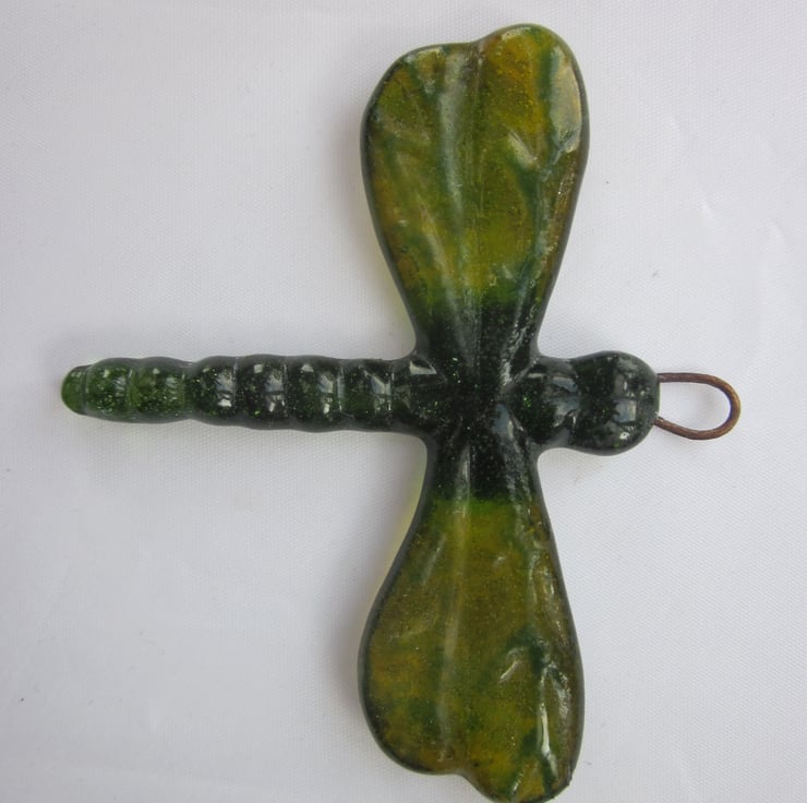 It is a stunning dragonfly, with an emerald green body and wings in chartreuse. The glass is very tactile with raised veins in the wings and three dimensional body. Beautiful! It has a copper loop as it's antennae, allowing this ornament to be worn as a pendant but it might equally be used as a small suncatcher in a window.