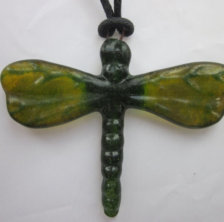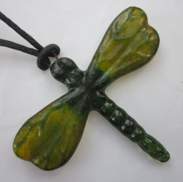 It is approximately 5cm high and 6.5cm across - this is a bold piece of costume jewellery and not a delicate trinket. It comes with a black cord necklace. A gorgeous piece, each dragonfly is individually made and one of a kind.