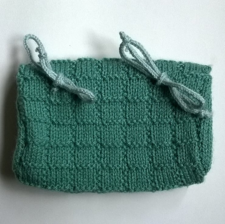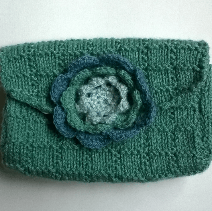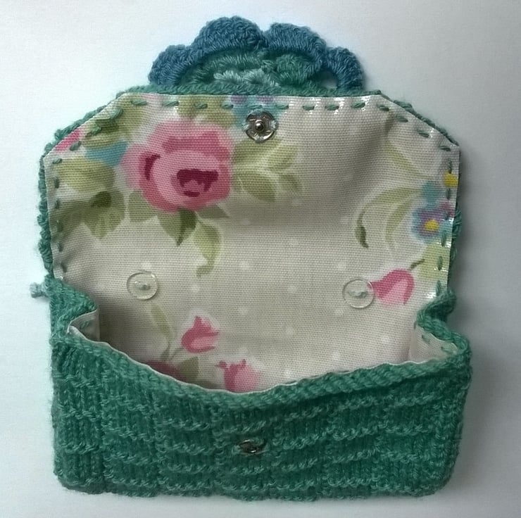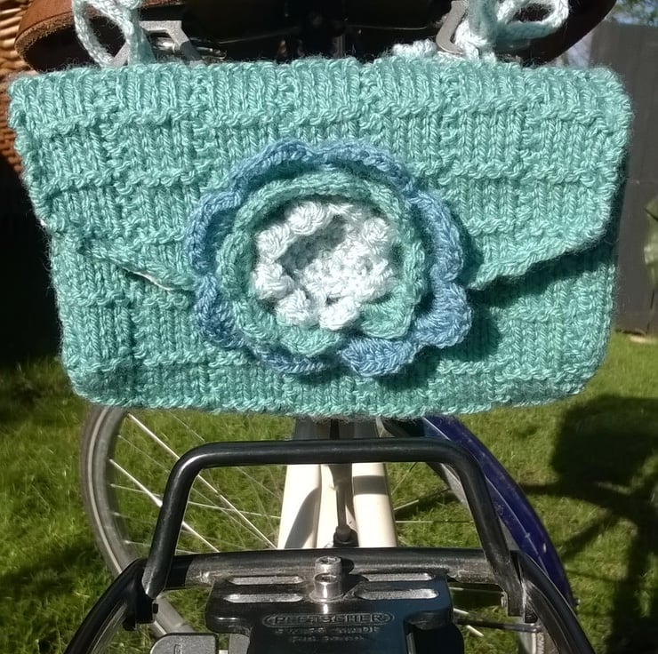 A beautifully 'vintage' green hand knitted saddle tool bag.The bag is knitted in a basket weave stitch, with a 3 colour crocheted flower on the front, in slate blue, green and ice blue.