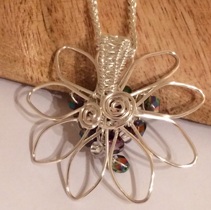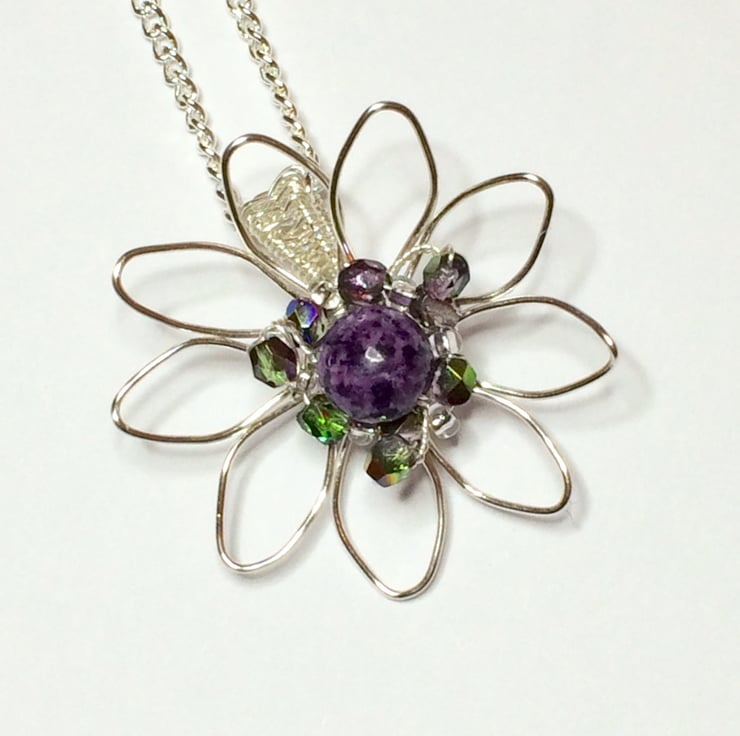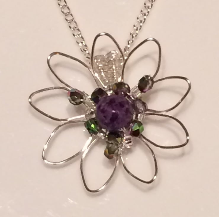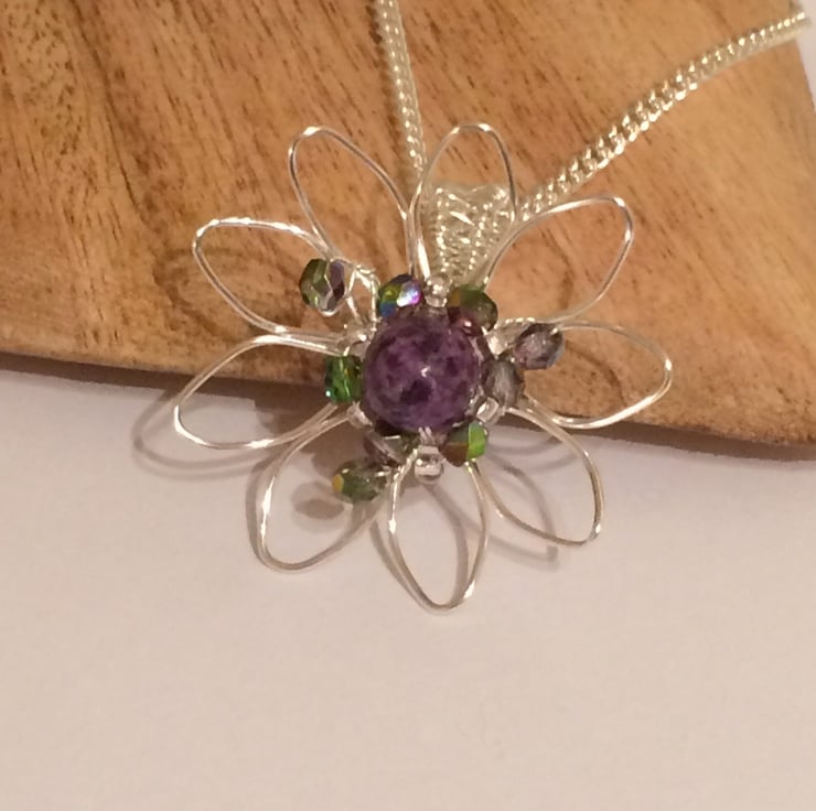 A pretty silver plated flower pendant with purple jasper centre bead, Czech fire polished magic orchard crystals (tones of green and purple) and silver lined seed beads. I have formed the shape of the flower with non tarnish silver plated wire using wirewrapping techniques and the pendant bail is created by wire weaving. This stunning pendant hangs on a silver plated chain with a lobster catch.