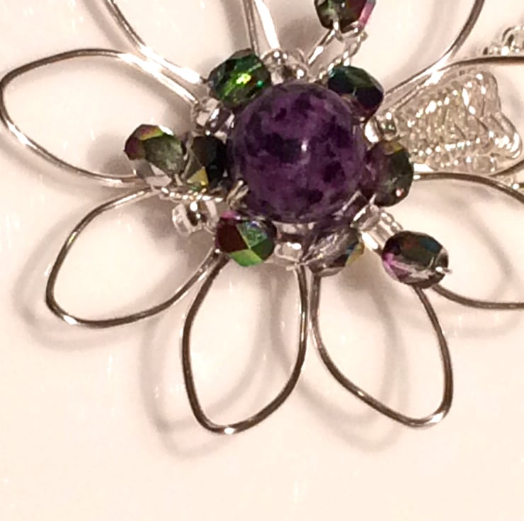 A pretty silver plated flower pendant with purple jasper centre bead, Czech fire polished magic orchard crystals (tones of green and purple) and silver lined seed beads. I have formed the shape of the flower with non tarnish silver plated wire using wirewrapping techniques and the pendant bail is created by wire weaving. This stunning pendant hangs on a silver plated chain with a lobster catch.