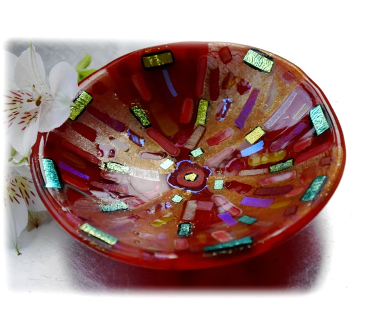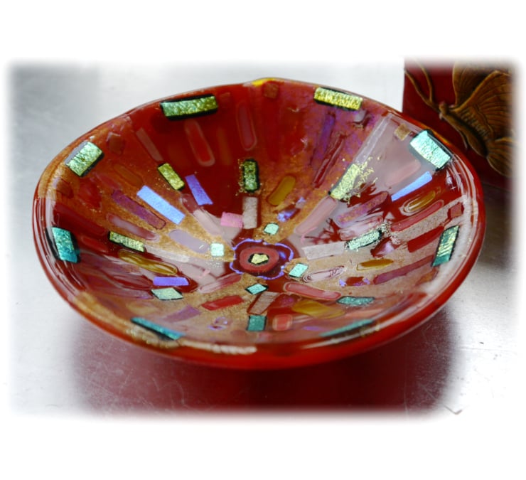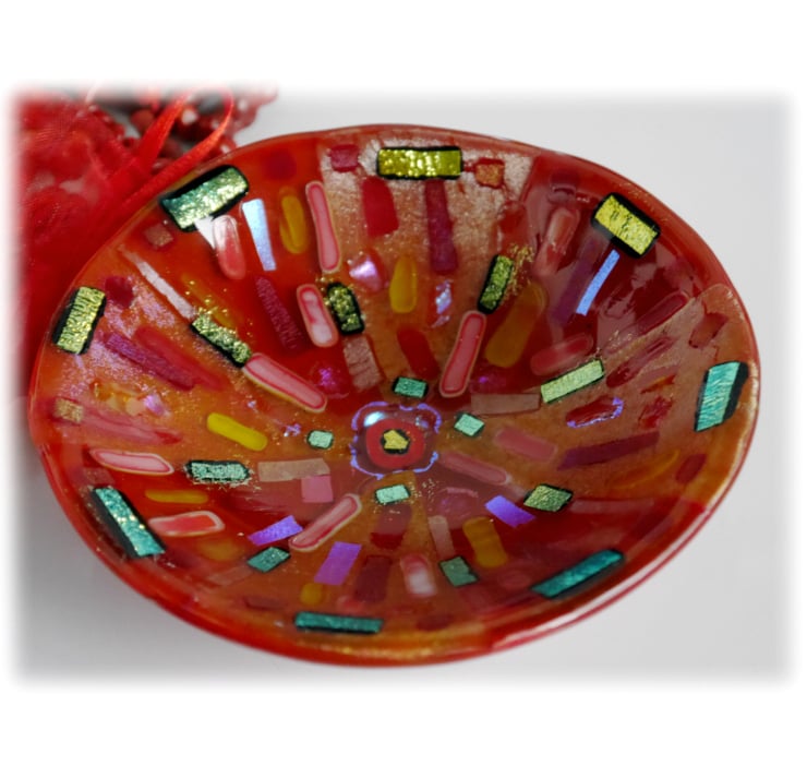 This is fused glass bowl, twice fired to very high temperatures in my kiln, first to fuse all the glass together as a flat circle, 2nd to slump it over a little mold into a dish.