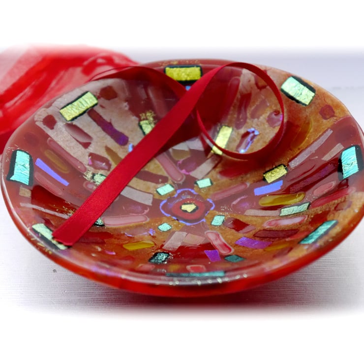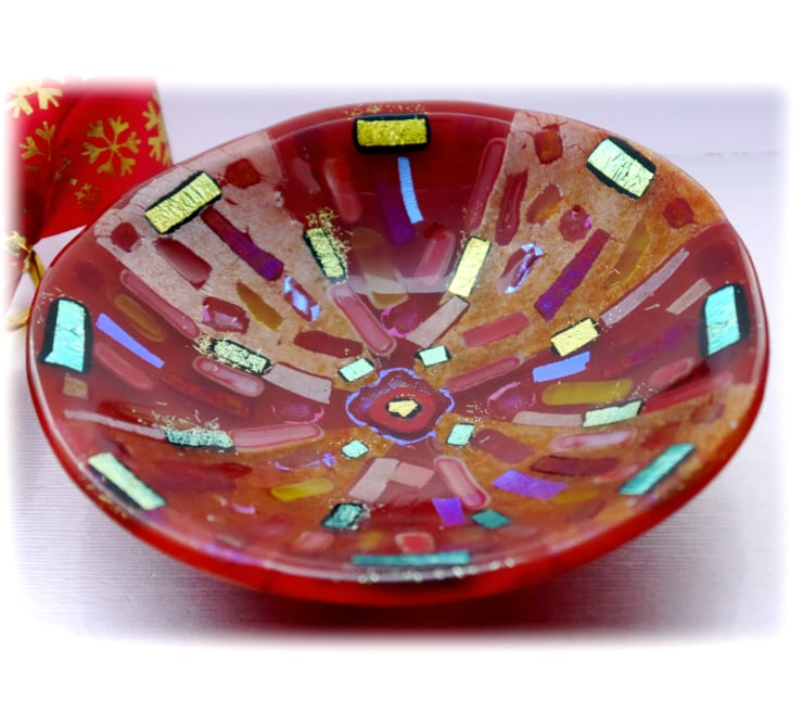 This round dish has a base of bright red iridescent glass topped with a 2 types of clear yellow glass, all very sparkly. I've decorated this with lots and lots of red and yellow and then clear and black backed dichroic. The overall effect is a very richly decorated piece of glass with an amazing shimmer.