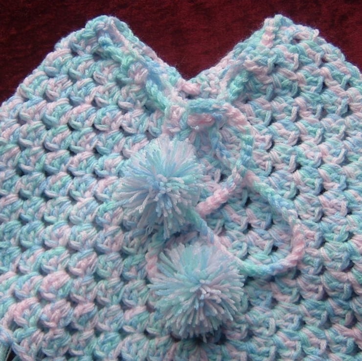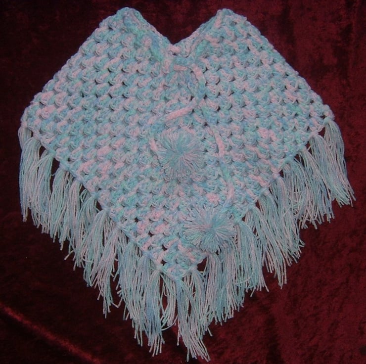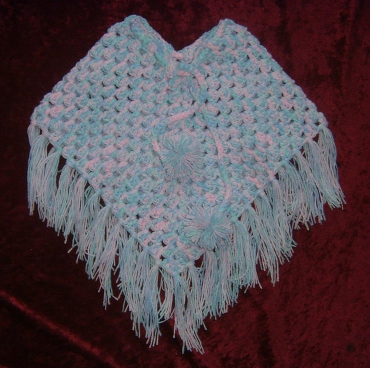 this tiny baby's poncho has been crocheted with a mixture of pink , blue and mint green acrylic yarn.