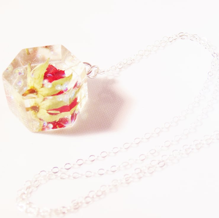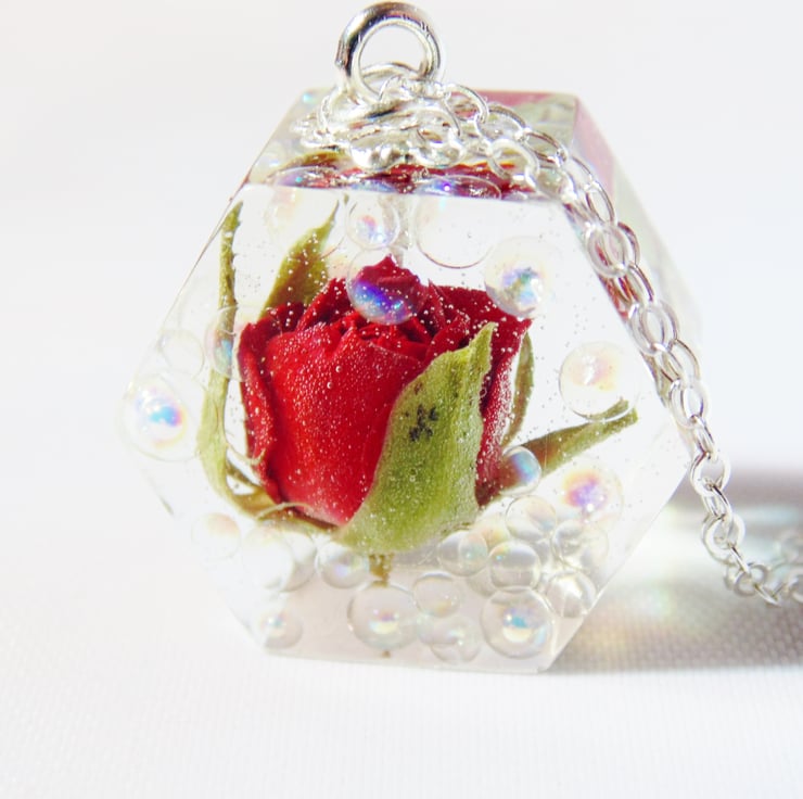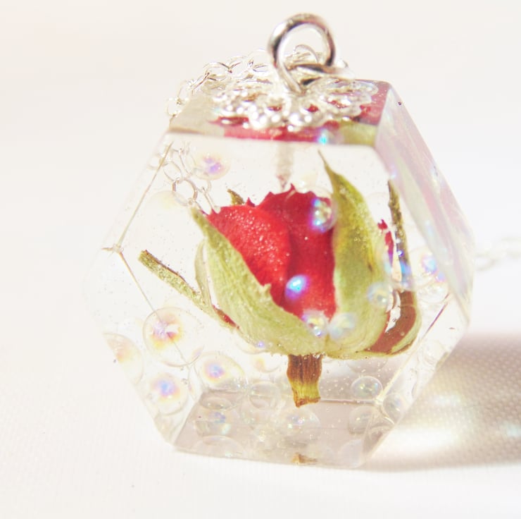Description: I have sealed this beautiful red rose in a hexagon shape resin piece along with sparkly dewdrop beads, they shimmer and capture the light beautifully, like little dewdrops nestled upon the rose, hangs on an 18" sterling silver chain. So romantic:))