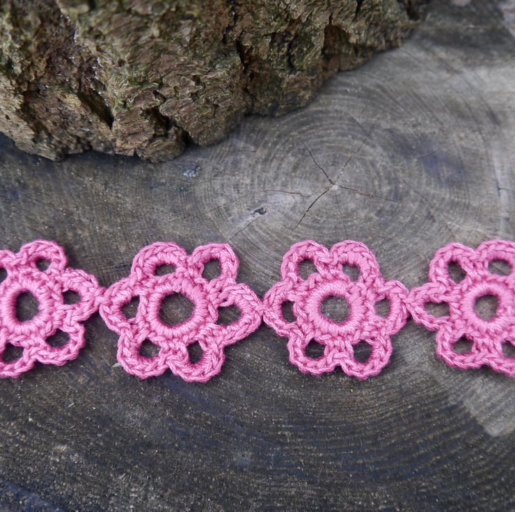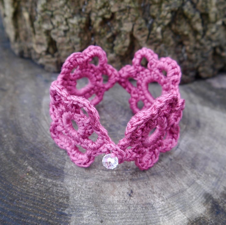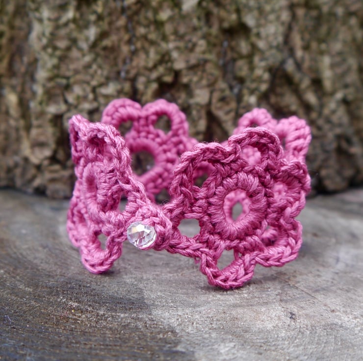 This pretty pink bracelet is hand crocheted using 100% cotton. It fastens with a crocheted loop and clear sparkly bead. It will fit most ladies wrists and measures approx 20cm in length and 4cm in height.