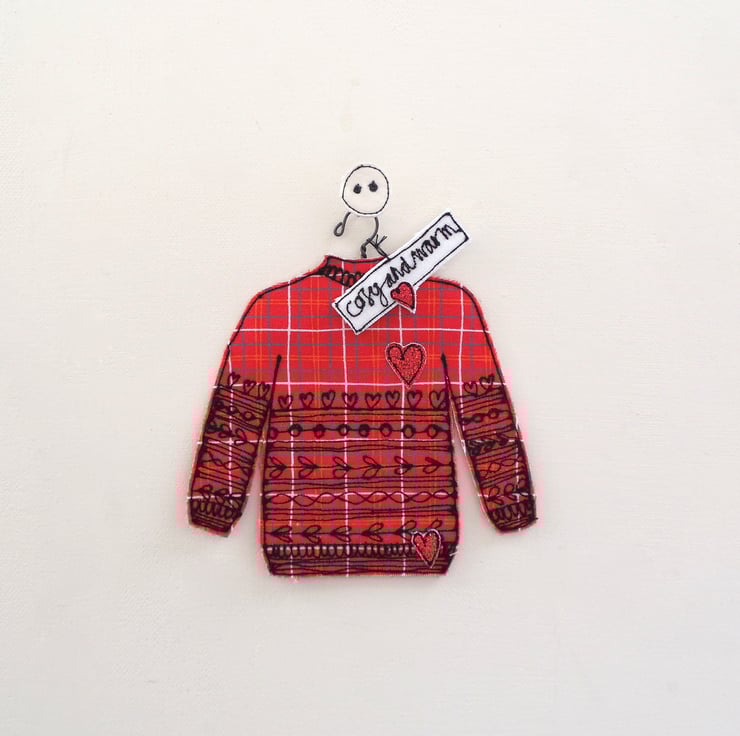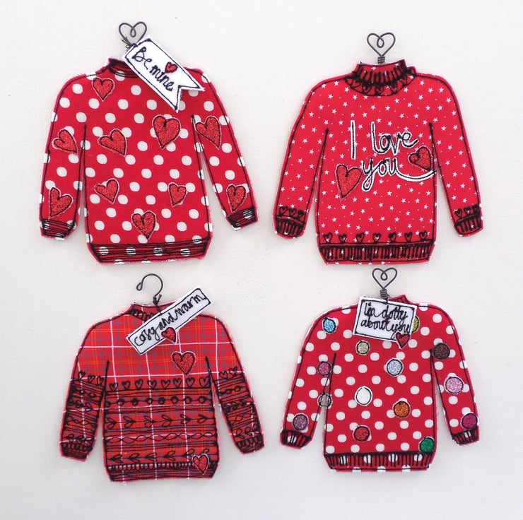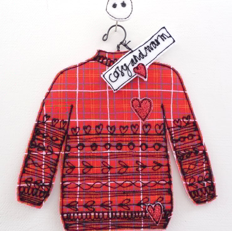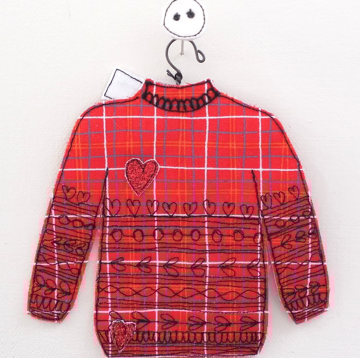 A miniature fabric jumper with a sewn pattern and accent glitter hearts, measuring approximately 13cm by 12cm, with a heart metal coat hanger to hang. Hang in a special place, to remind the ones you love how you feel.