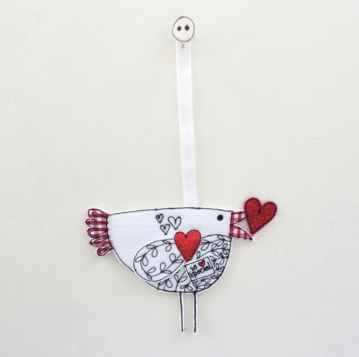 A linen fabric birdie holds a red glitter heart with a sewn fabric label 'so special'.