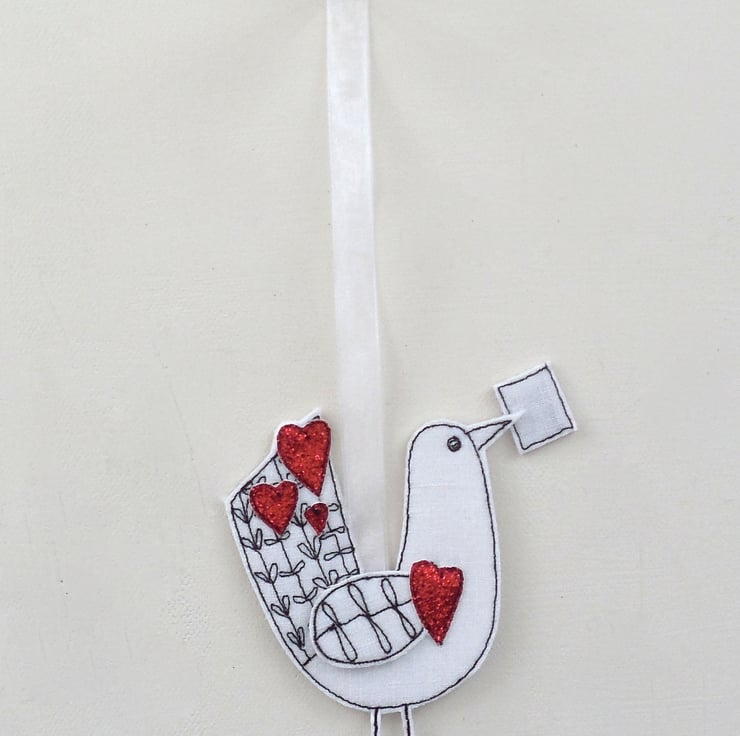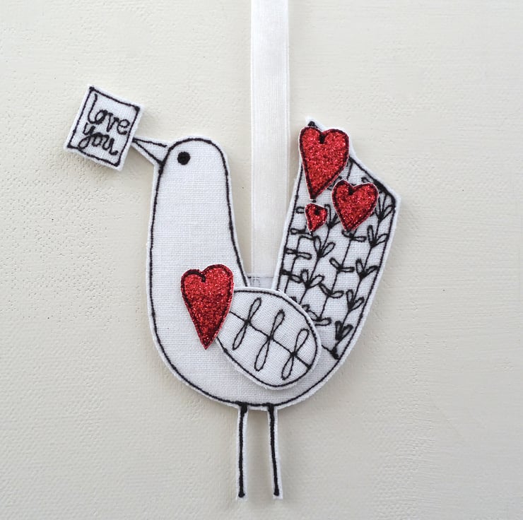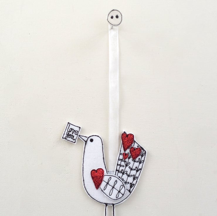 A white linen fabric birdie measuring approximately 9cm by 10cm, with a white ribbon to hang, holds a sewn fabric label 'love you'. A unique gift for your Valentine. Your linen birdie will be sent in a glassine envelope with a heart label to close.