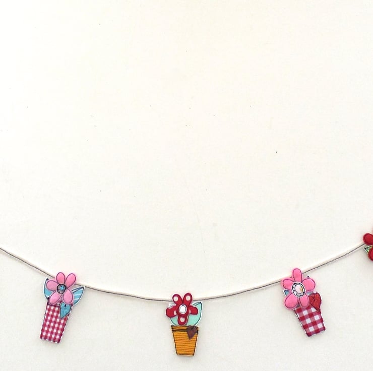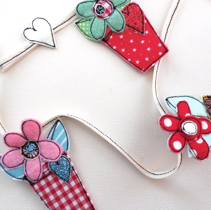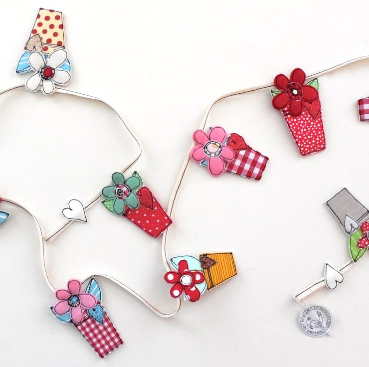 Flower pot bunting measures approximately 120cm with nine flower pots suspended along its length. Each pot is sewn using different cotton cloths and has a glitter fabric accent. At each end of the length there is a loop to hang and a glitter heart. This delightful decoration can be used to decorate many different rooms in your home.