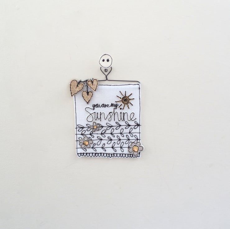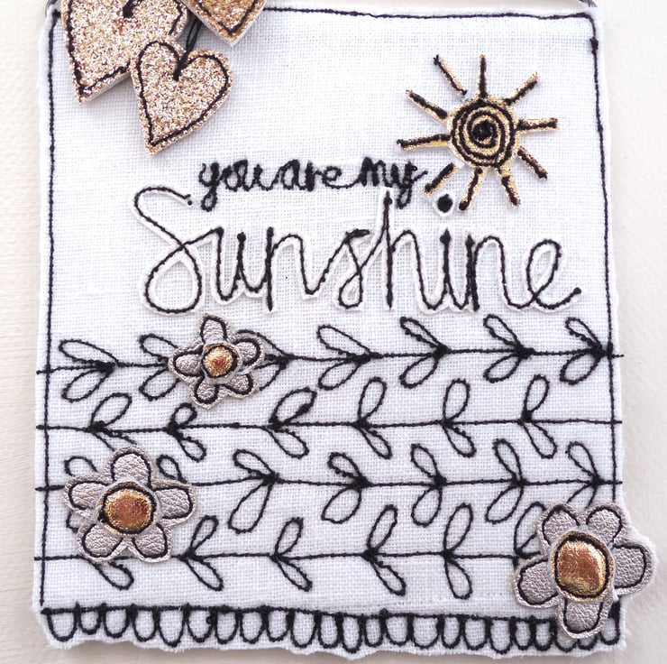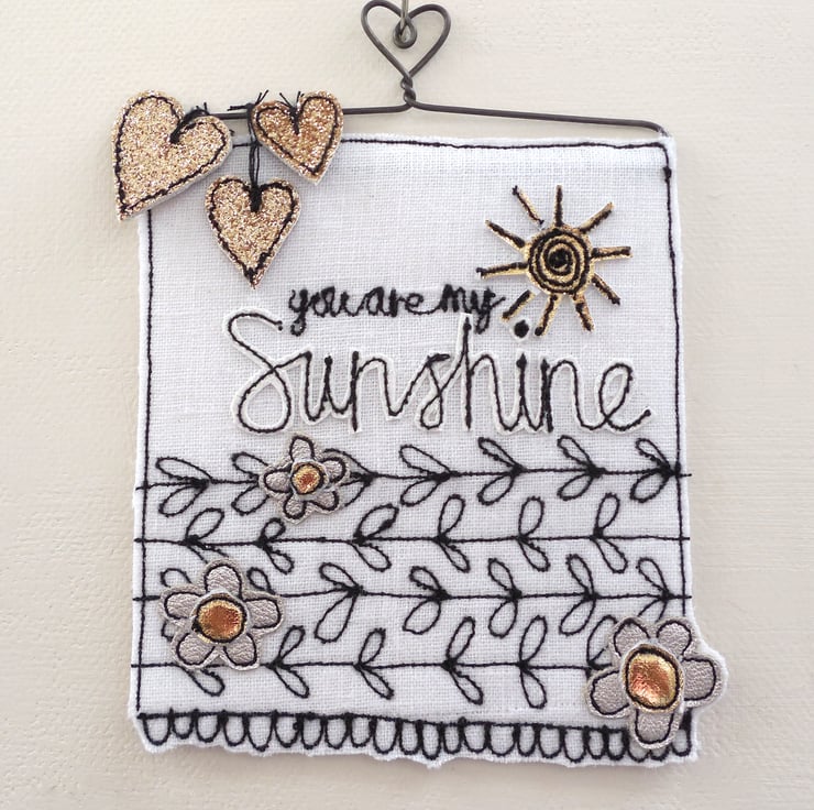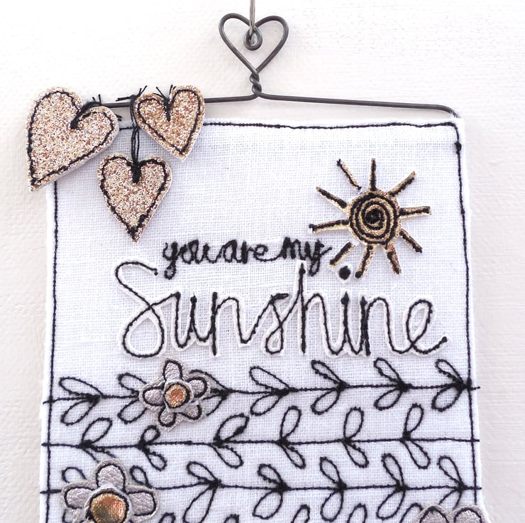 A white linen fabric banner, suspended on a wire heart hanger. Sewn and appliquéd words 'you are my sunshine', leaves, flowers, the sun and three glitter hearts adorn the front.