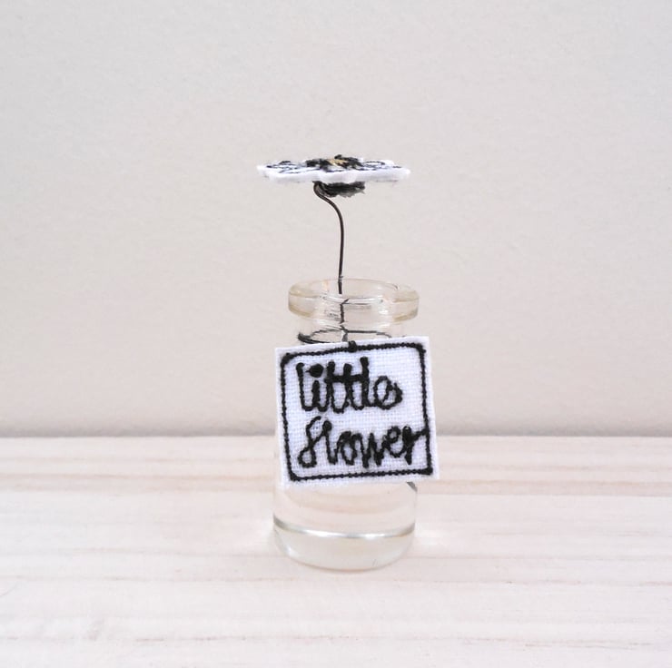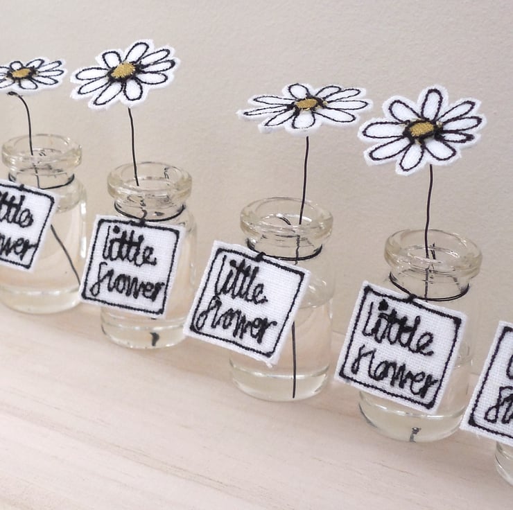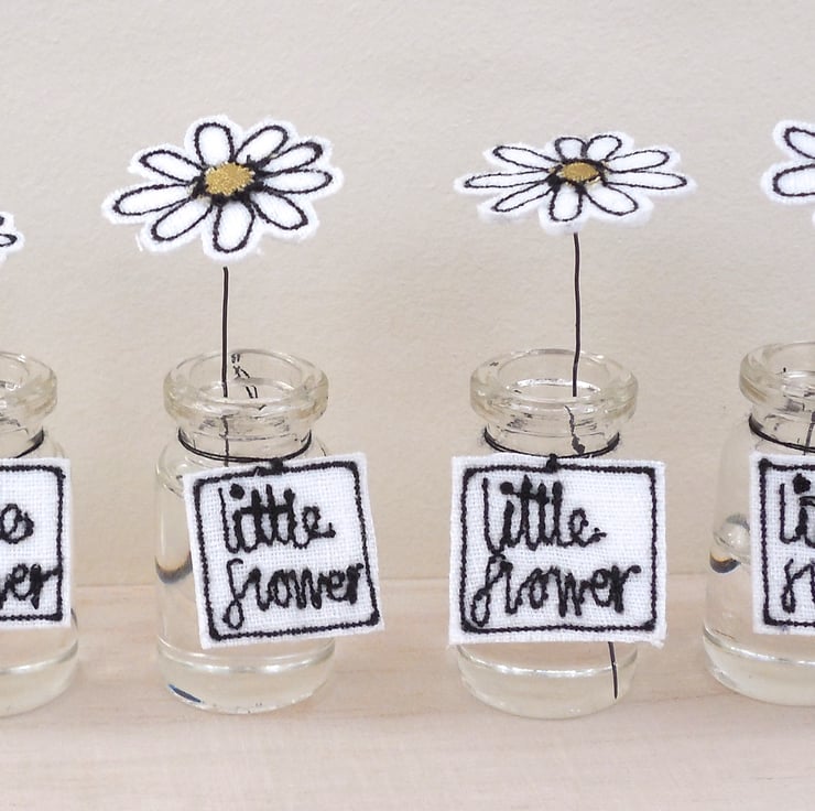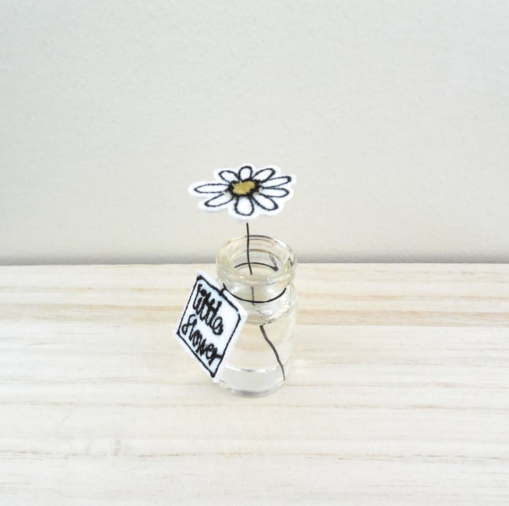A miniature fabric daisy sits in a miniature glass bottle. The flower is created using sewn fabric with a wire stem holding it in position in acrylic water. Around the bottle neck hangs a sewn fabric label saying 'little daisy'.
