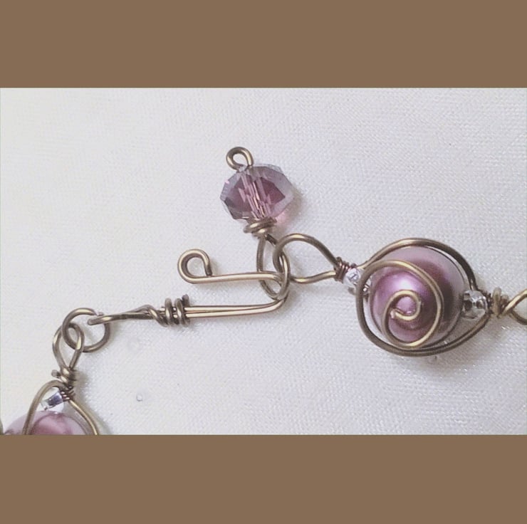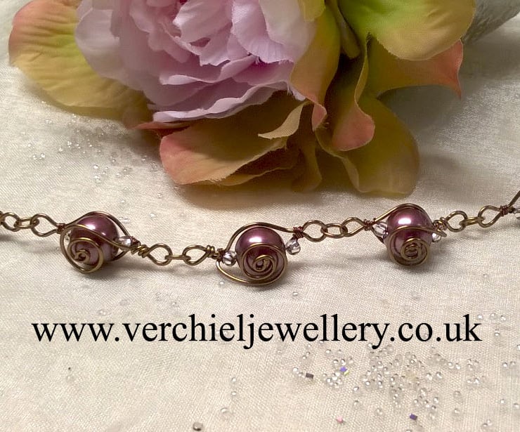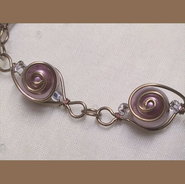 Bronze coloured Wire wrapped swirl effect Bracelet with brown glass pearls (with pink tones). Each Bead individually wire wrapped with ornate handmade hook clasp and crystal end. Standard length of 7-7/14 inches. Can be custom made to measure.
