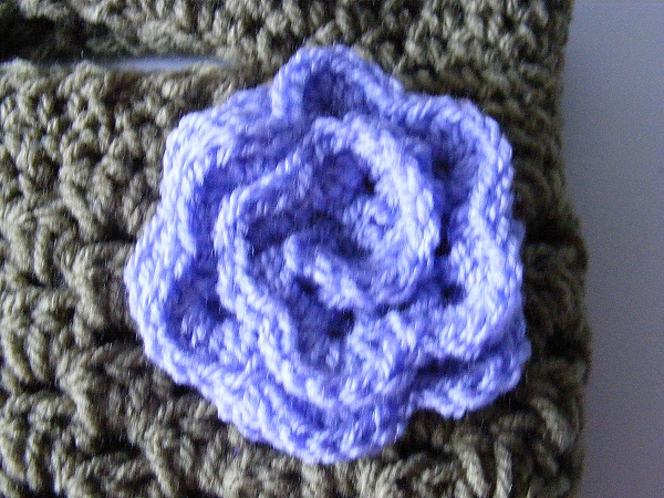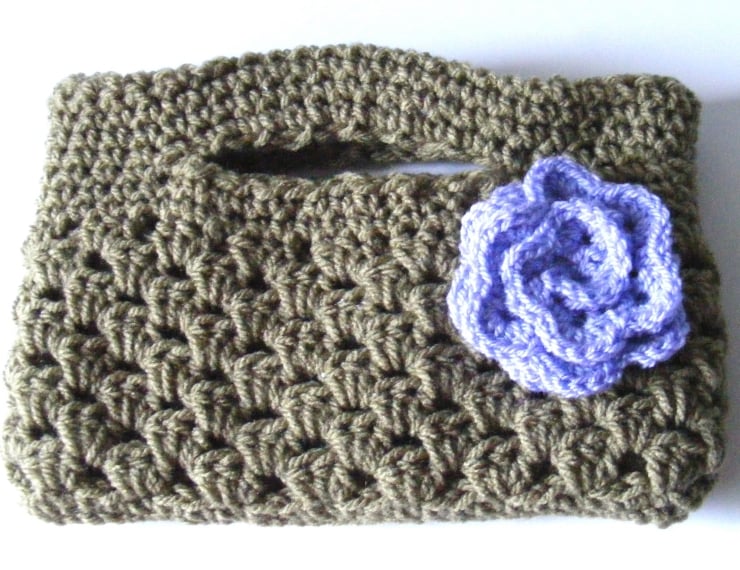 Crocheted bag or tablet holder in sage green Aran weight yarn, with an applied lilac flower. Will hold a tablet up to 225mm x 128mm, e.g. up to and including a HUDL 2.