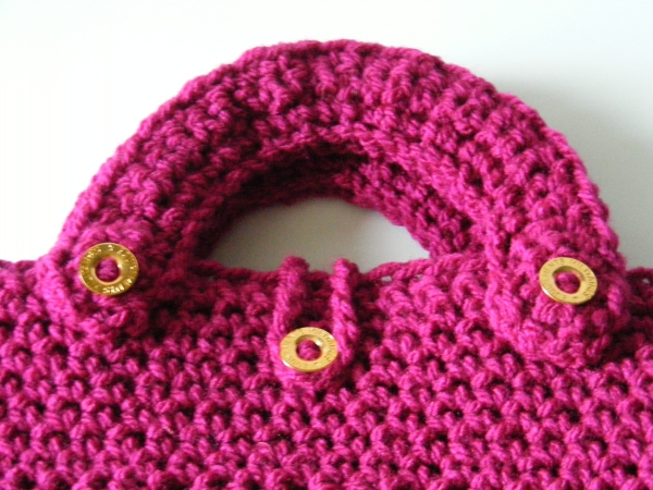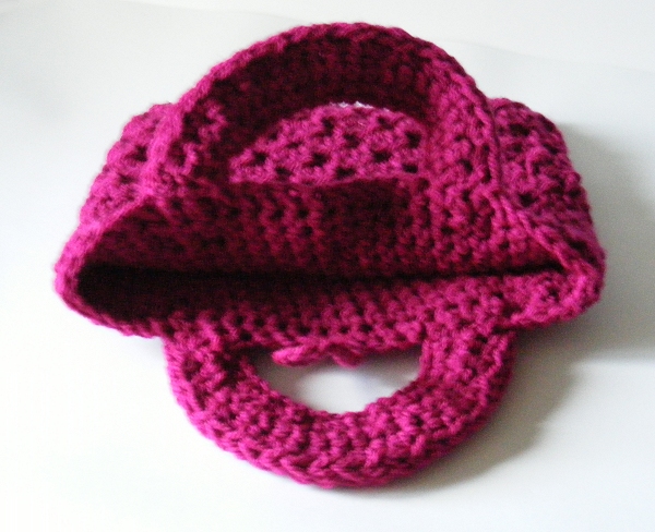 Crocheted bag or tablet holder in burgundy red Aran weight yarn, with gold-coloured metal buttons.