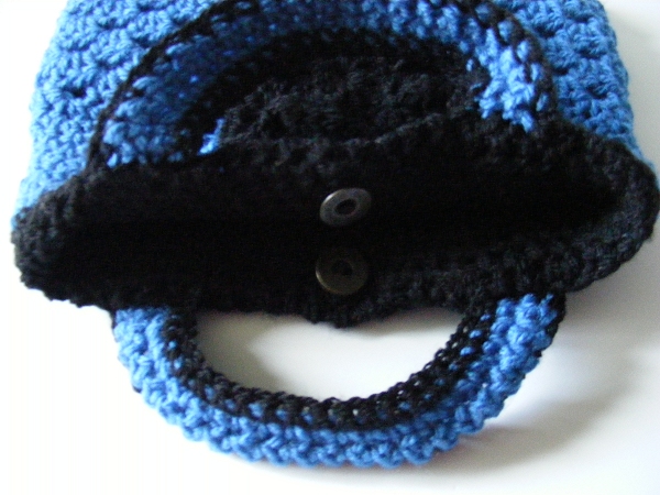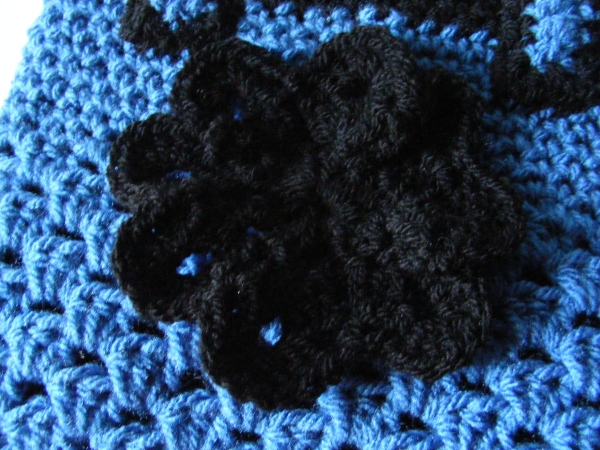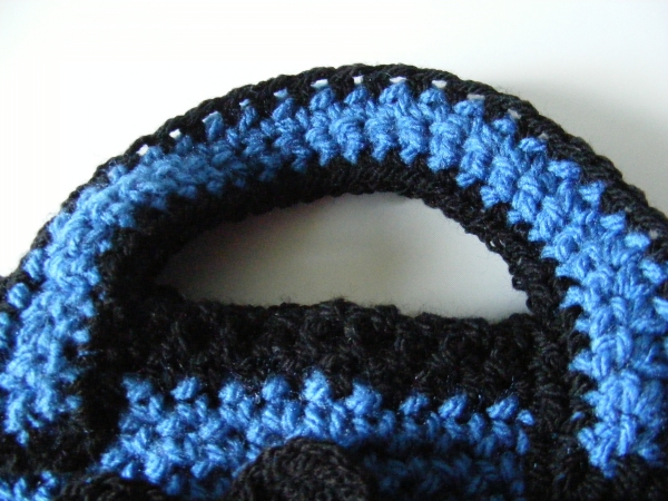 Crocheted bag or tablet holder in blue with black trim and an applied black flower motif.