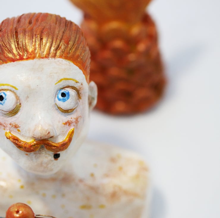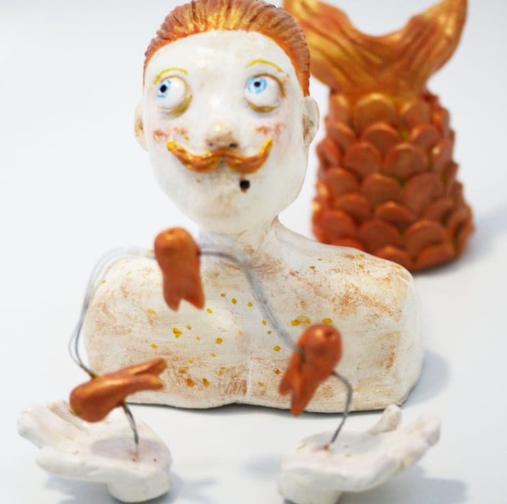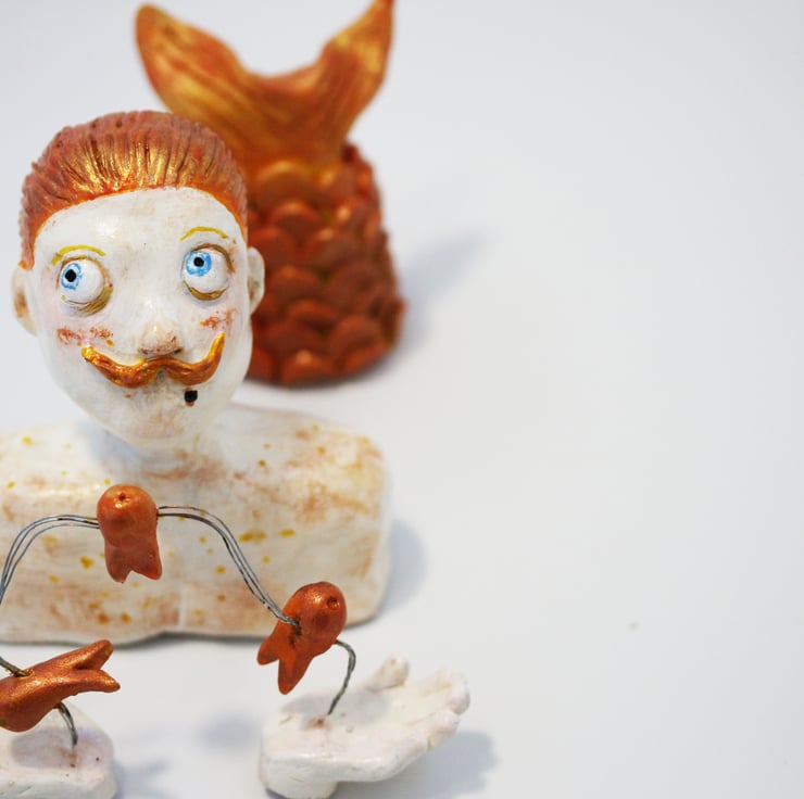 Here is our poor George, always trying to impress to mermaids with his juggling skills. unfortunately for him he always seems to loose a few fish while performing, and his sensitive skin takes a bit of a battering in the sun.