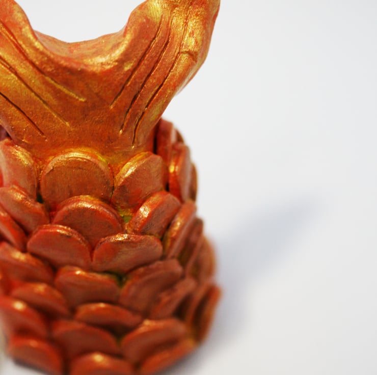 Made from air dry clay and decorated with acrylic paints and mica powders, George's tail is wonderfully gold and shimmers in the sun.