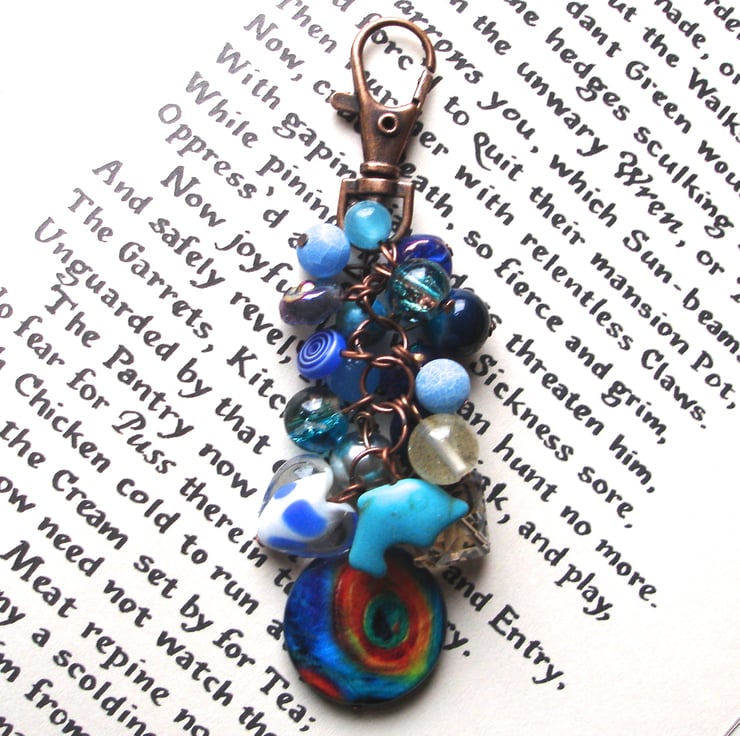 These funky bag charms are ever so popular! This super cute charm combines a fantastic cluster of blue beads and charms on copper pins. It contains a lamp work glass spotted heart bead, a howlite dolphin, a chunky glass crystal and a fab peacock pattern glass disc bead. The copper clip attaches to your bag, or could also go on a set of keys. An on-trend stand out piece which will really prompt conversation.