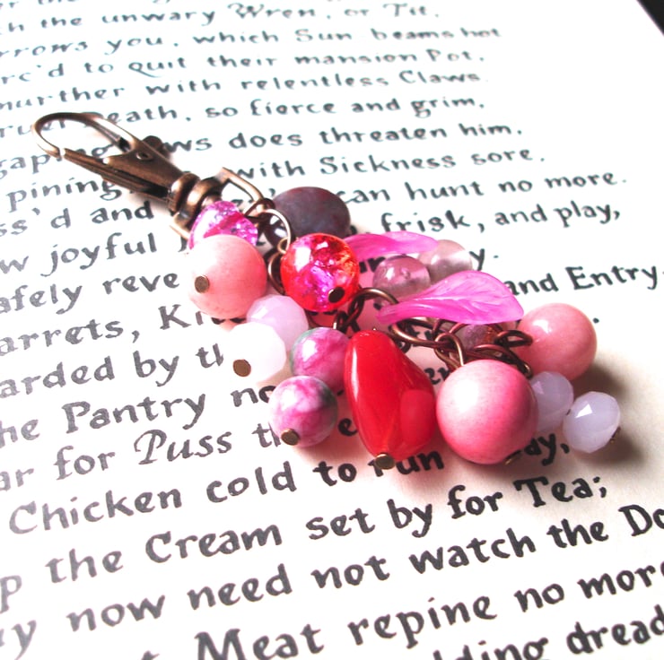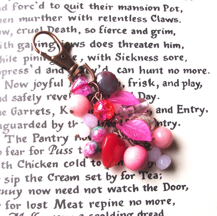 These funky bag charms are ever so popular! This super cute charm combines a fantastic cluster of pink beads and charms on copper pins. It contains a lamp work glass striped heart bead, lucite leaves, a lots of glass crystals. The copper clip attaches to your bag, or could also go on a set of keys. An on-trend stand out piece which will really prompt conversation.