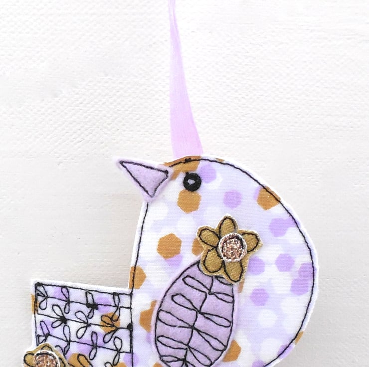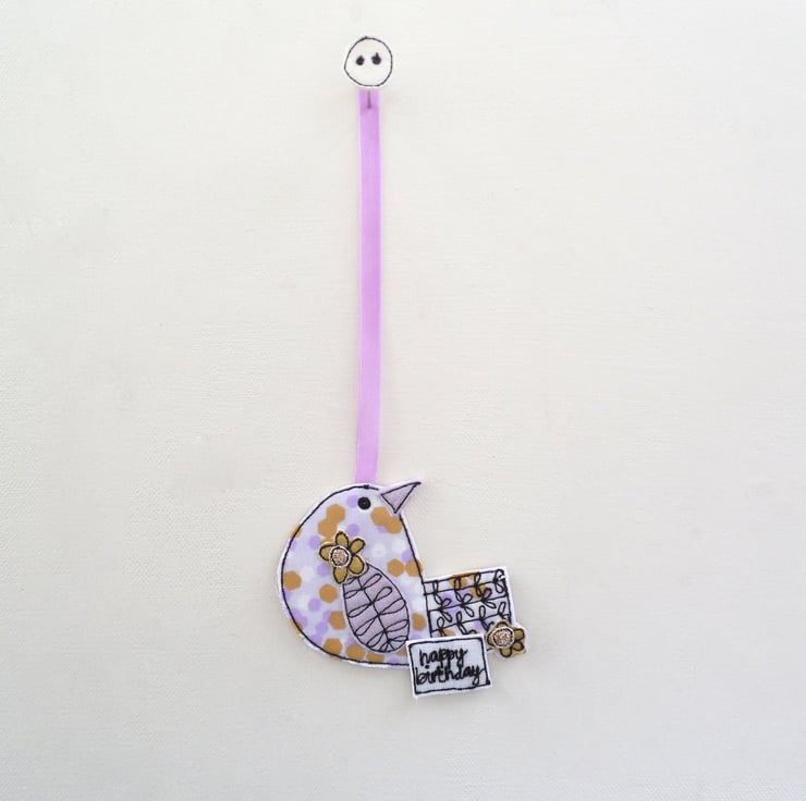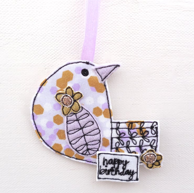A lilac fabric birdie measuring approximately 7cm by 7cm, with a lilac ribbon to hang, in lilac cotton with metallic gold dots, two golden flowers and a sewn fabric label 'happy birthday'.