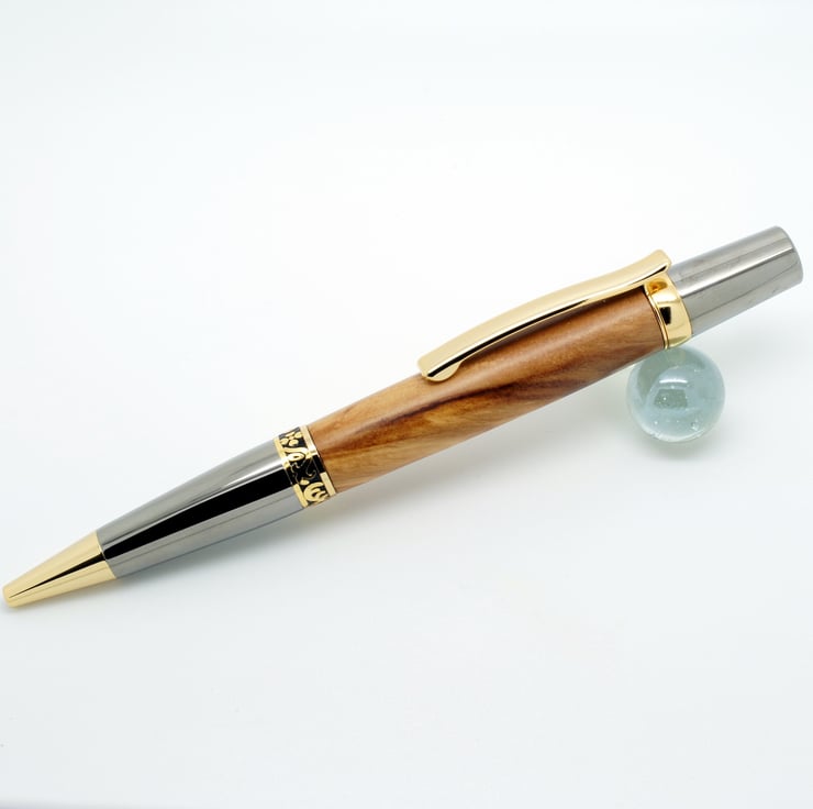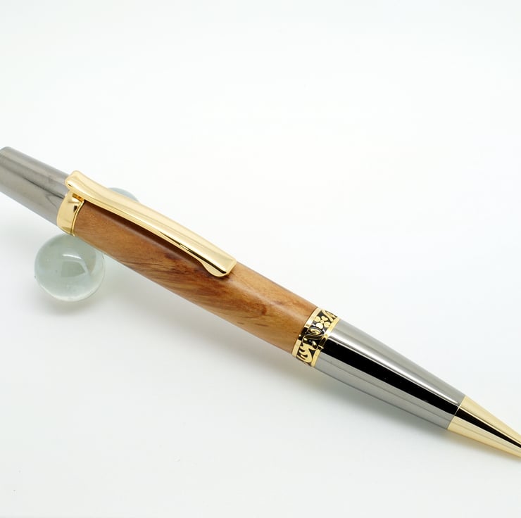 This pen was handturned by me in my workshop in suffolk, the metal parts are gold & trivellent chrome finish, Included in the price is a black card presentation box & Protective velvet sleeve