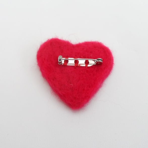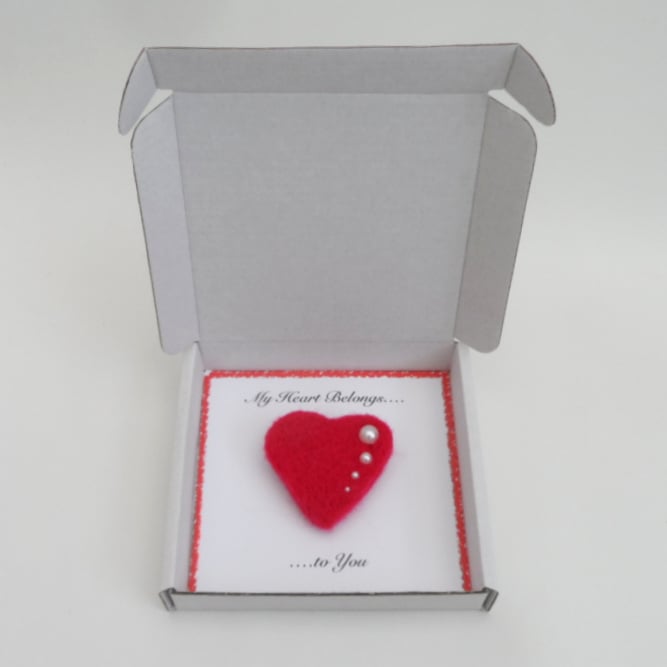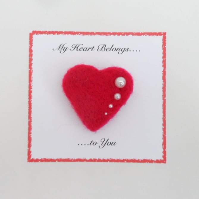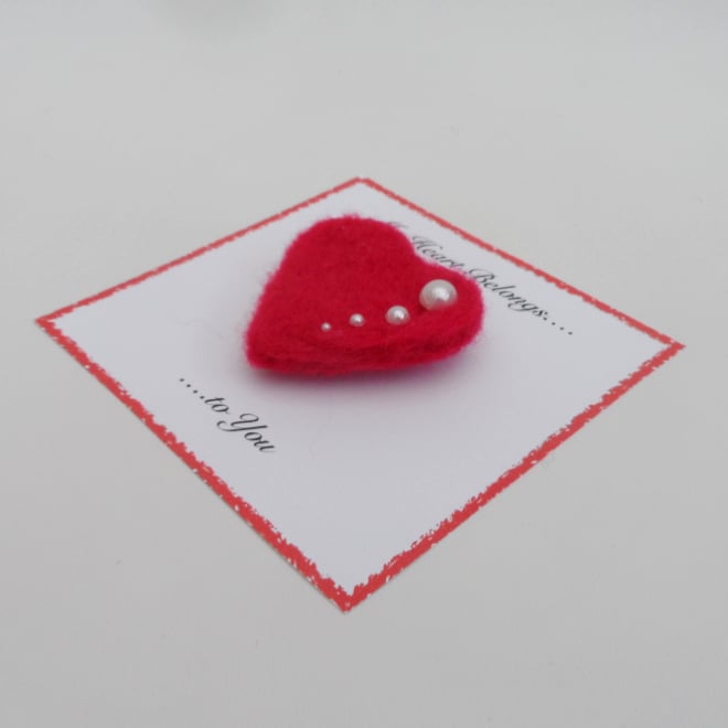 This sweet love heart has been needle felted using red merino wool. Four flat back half pearl embellishments in reducing sizes have been added to the front of the heart. On the reverse a silver tone brooch pin has been stitched allowing it to be worn as a brooch or pinned to a bag, although this can be removed if required. It has then been mounted on white card which has the message "My Heart Belongs....to You" printed on it.
