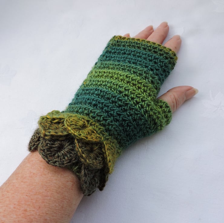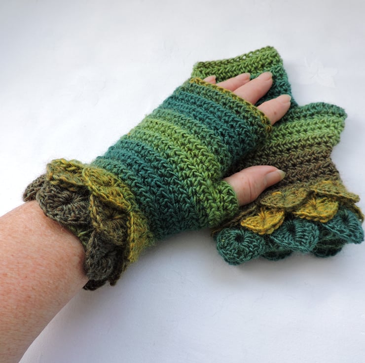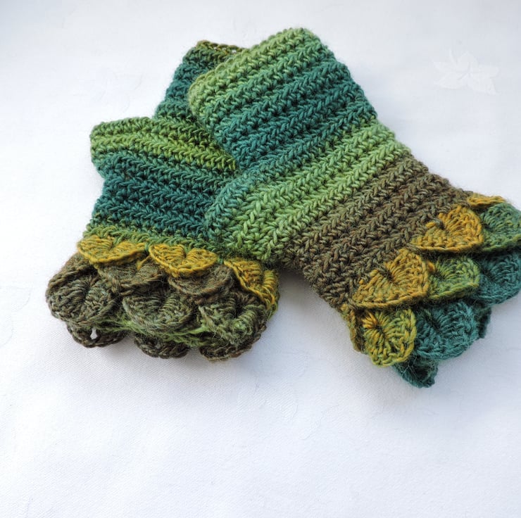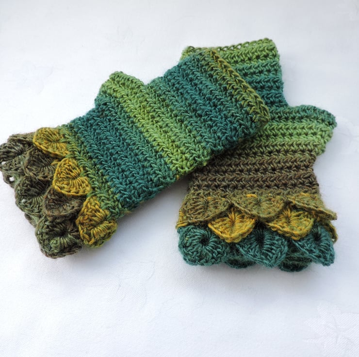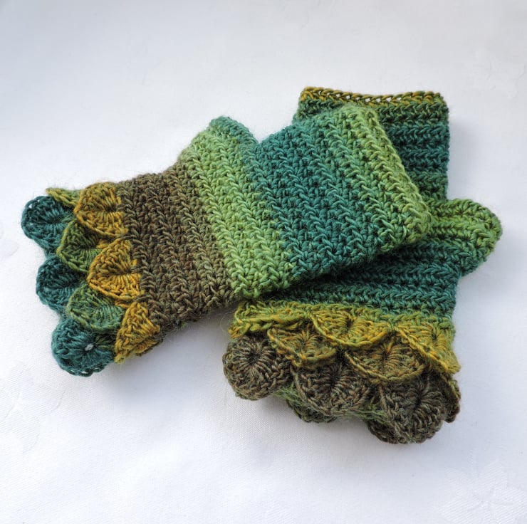 I've crocheted these adults fingerless mitts cum wrist warmers in a soft wool and acrylic double knit yarn in graduated greens and mustard. They have three layer crocodile stitch cuffs and plain body. They are warm and cosy.