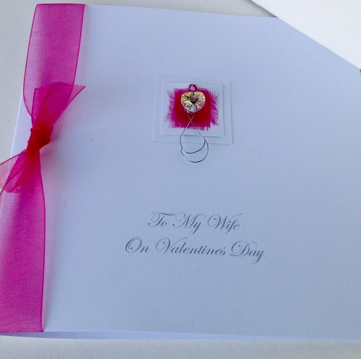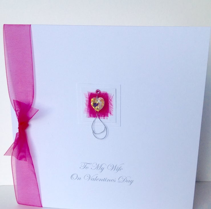 The listing is for a Valentine's Day Card,featuring a Crystal Heart on a frayed organza square mount.