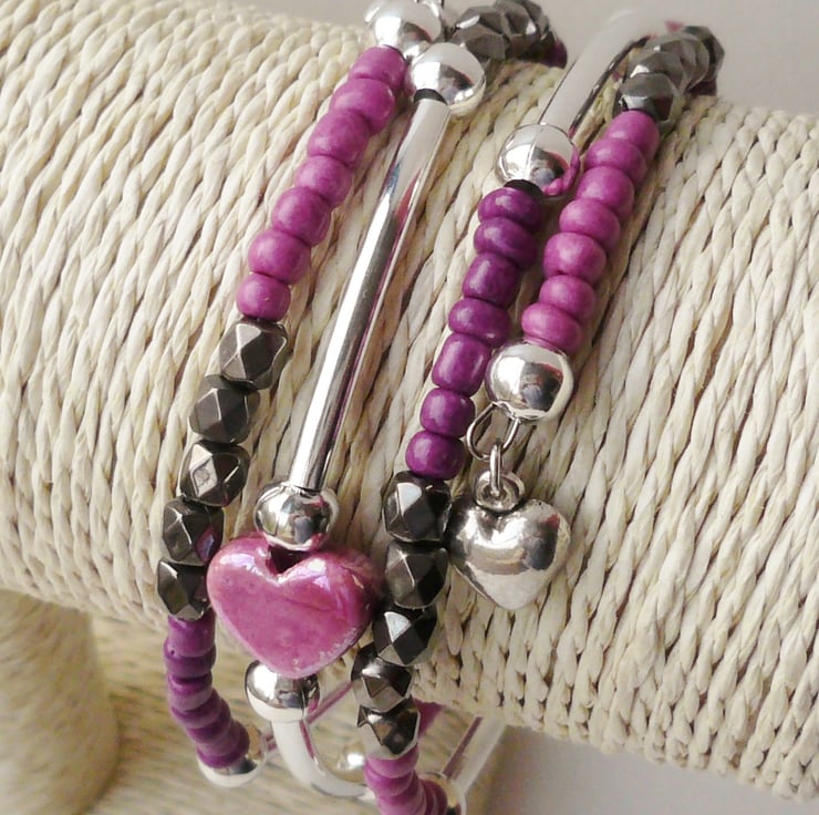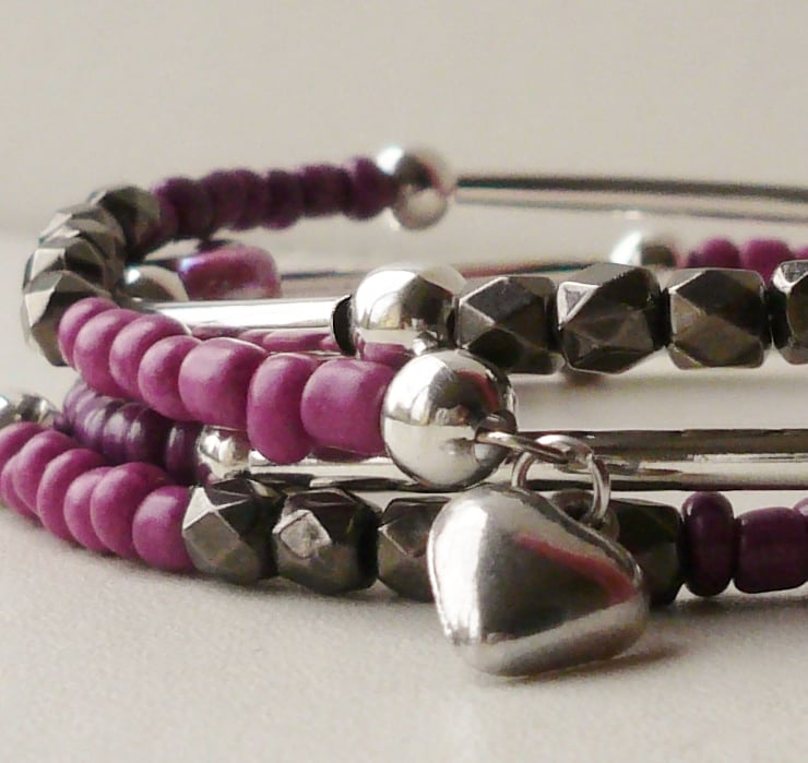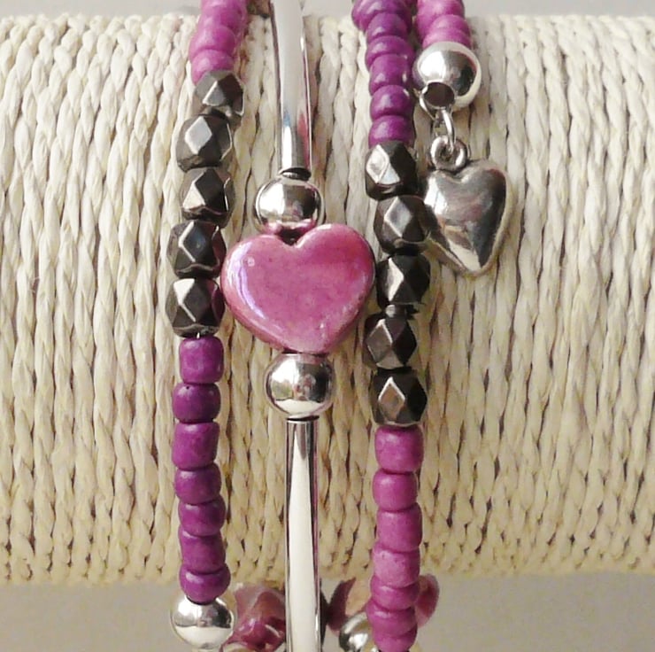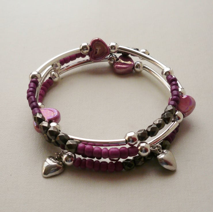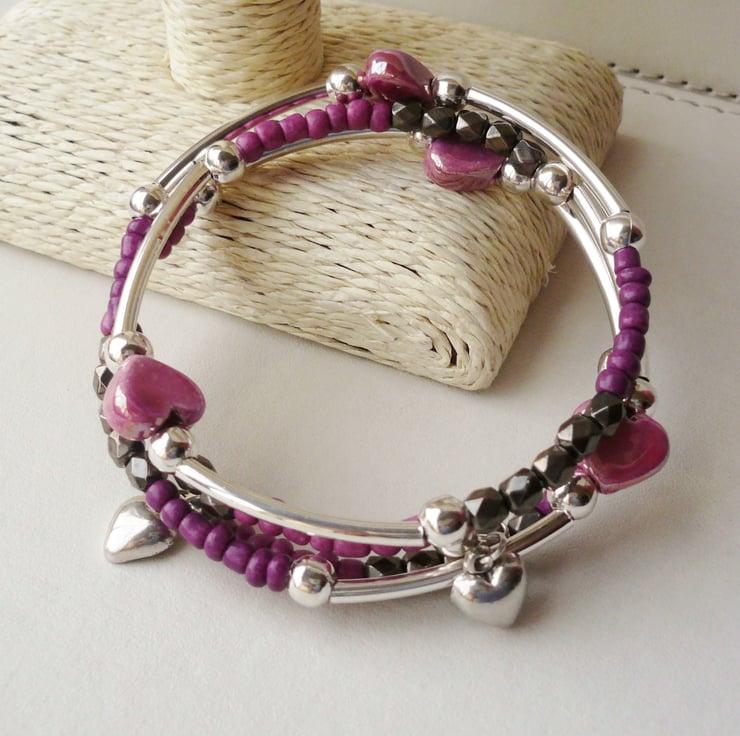 This pretty bracelet/bangle is made up of 5mm long smokey grey acrylic faceted beads , 3mm glass seed beads in two shades of pink and co-ordinating 11mm wide pink ceramic heart beads. Also includes Tibetan silver round beads and 30mm long curved Tibetan silver tube spacers. These have all been threaded onto three coils of silver plated memory wire and finished off with a Tibetan silver heart charms at each end.