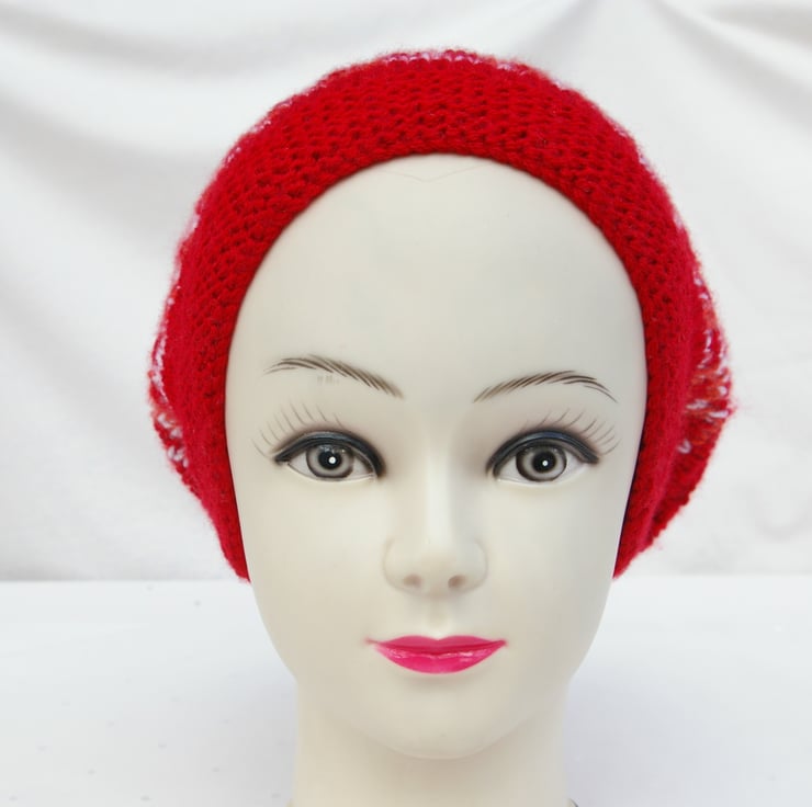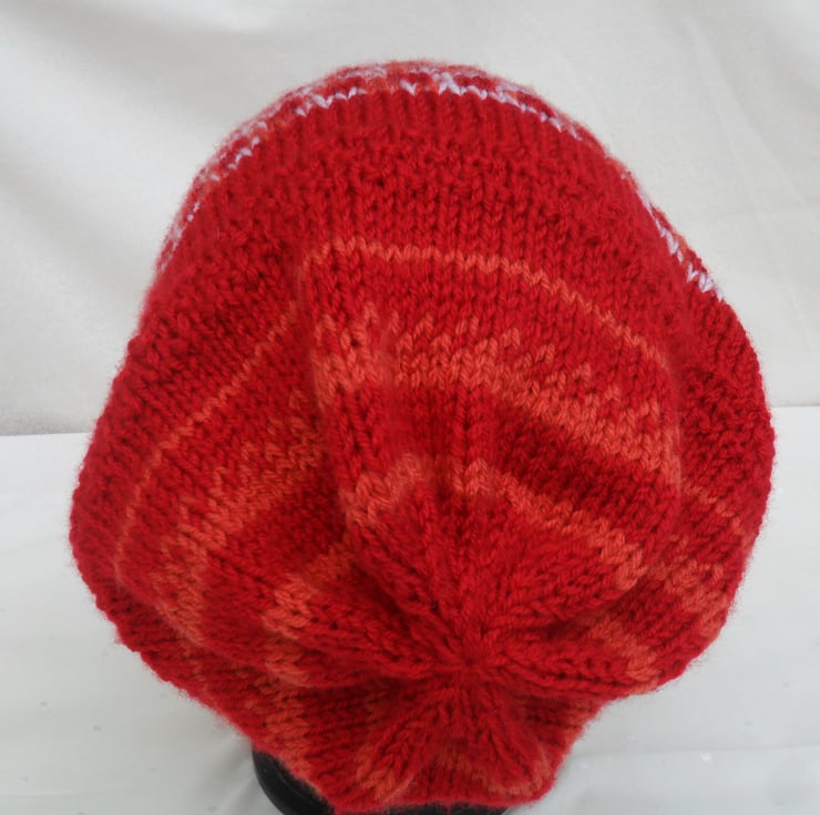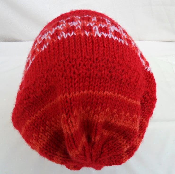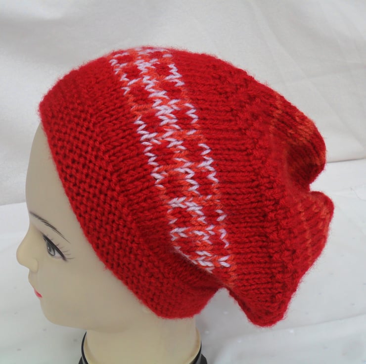 A hand knitted Adult Slouch Beanie Hat. This great hat has been knitted with two strands of Double knitting yarn so is extra warm. The brim as been knitted in garter stitch, while the main body of this great hat has been knitted mainly in stocking stitch with a band of pattern work. The hat is loosely based in the Fair Isle tradition where working with more than one colour is used to develop patterns and colour designs in a piece of knitwear. The pattern was developed as I knitted the hat, I did not follow any pattern just made it up as I went along. This like all my hats made in this fashion is a one off because making things up as I go along means every pattern is unquie and will not be repeated.