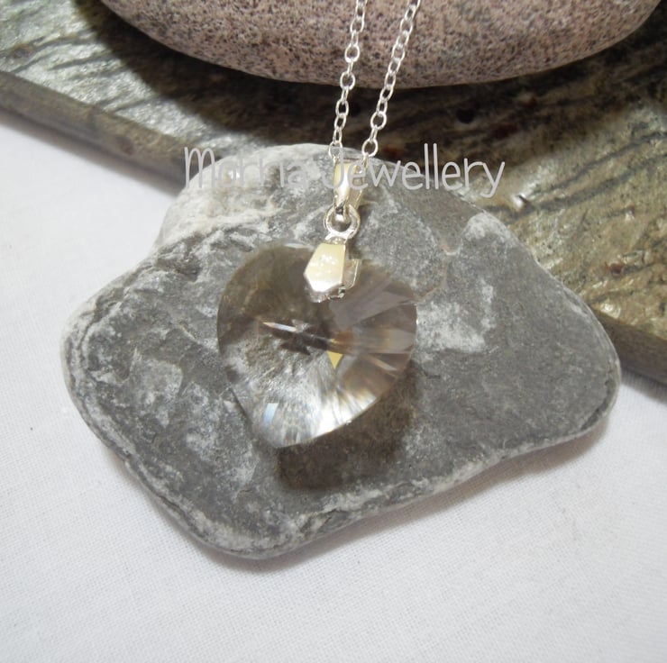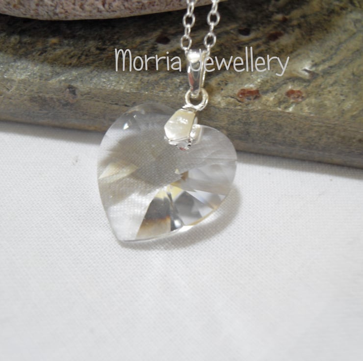 An 18mm high end crystal heart pendant on sterling silver chain with sterling silver bail hangs from a 16" sterling silver chain.