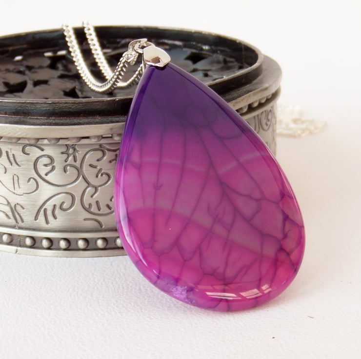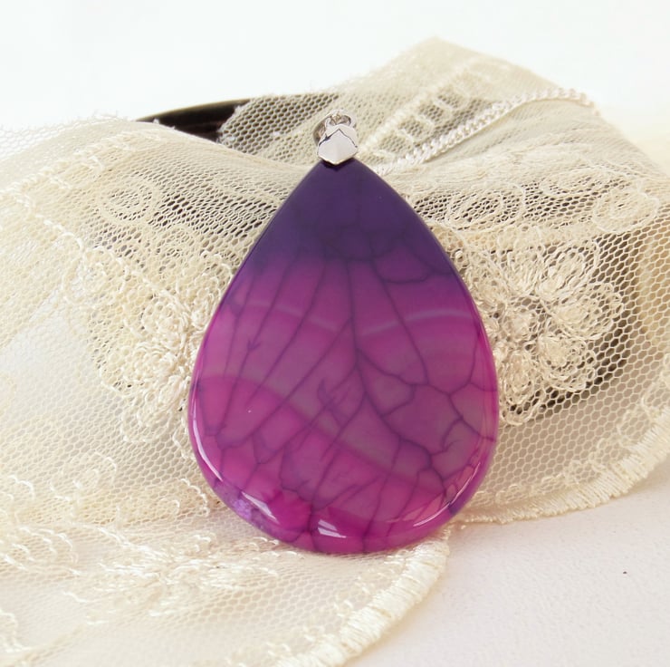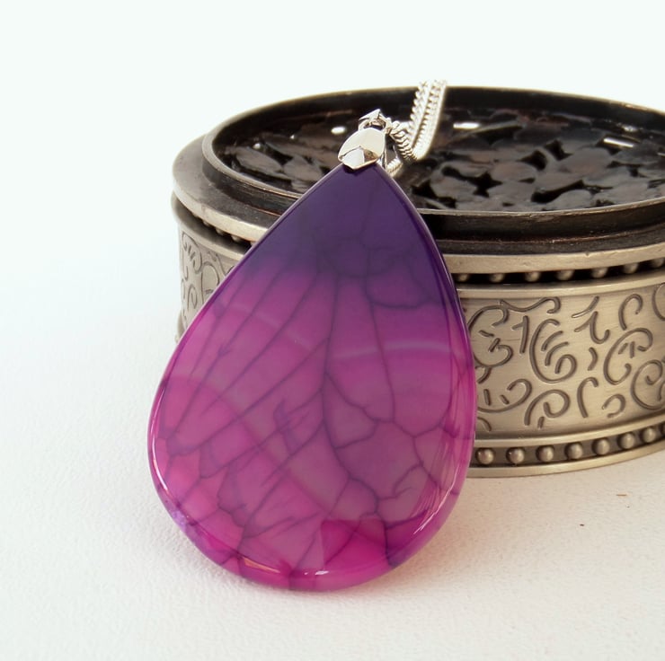 An unusual and beautiful pink and purple agate pendant that hangs from a silver plated chain to create a gorgeous necklace.