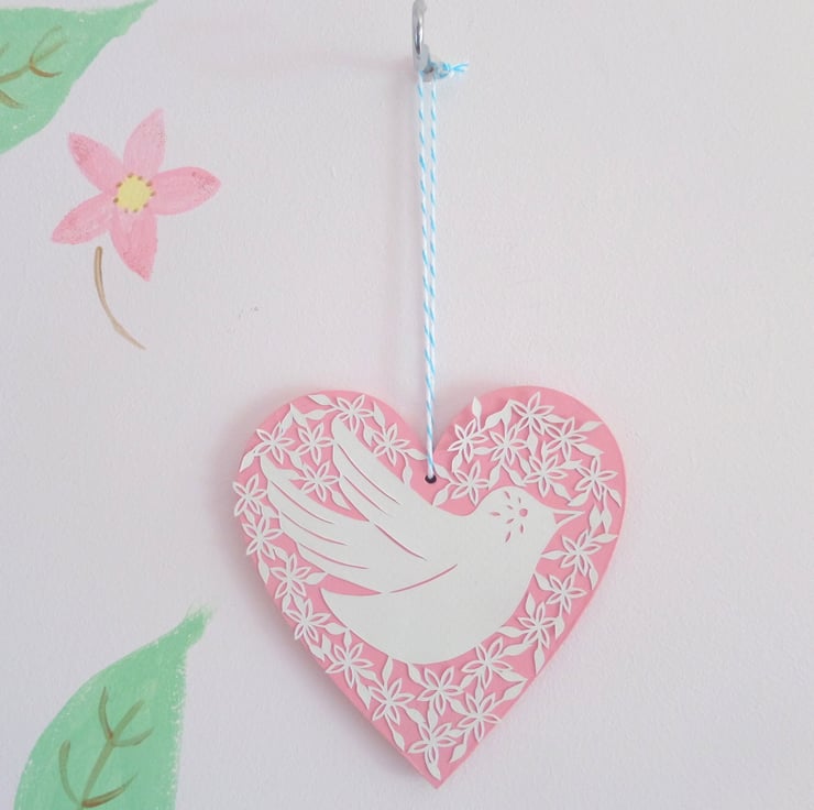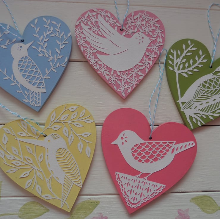 The wooden heart measures approx 100 x 100 mm and is approx 5mm thick. It has been hand painted in acrylic paint and the whole piece has been finished with varnish and hung with baker's twine.